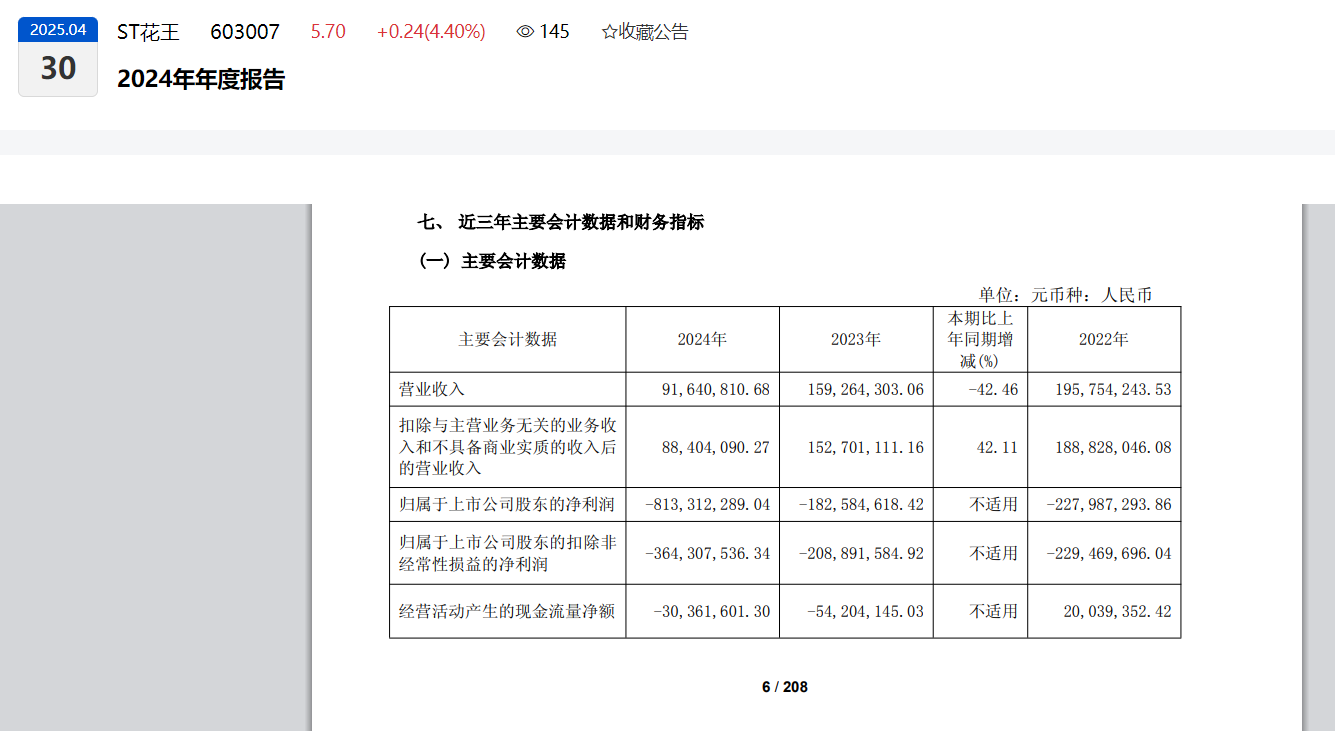 再看一个案例,*ST花王2024年营业收入为9164.08万元,同比下降42.46%;归母净利润为-8.13亿元,同比下降345.44%;扣非归母净利润为-3.64亿元,同比下降74.40%。
