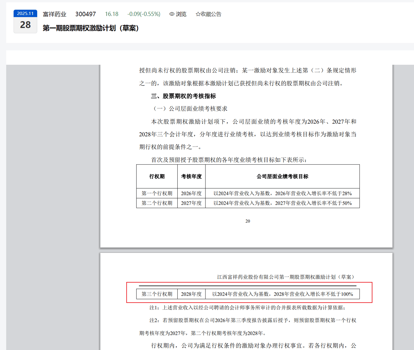 确实,以富祥药业为例,其推出的股权激励,考核要求2028年营收较2024年翻倍。但只要老板是实控人,这个目标通常是内部“商量”出来的——肯定要事前开会嘛,老板问财务总监“你觉得什么目标合适”?销售总“你的意见呢”?不然定一个太跳脱的目标,员工觉得无法完成,市场也会质疑。