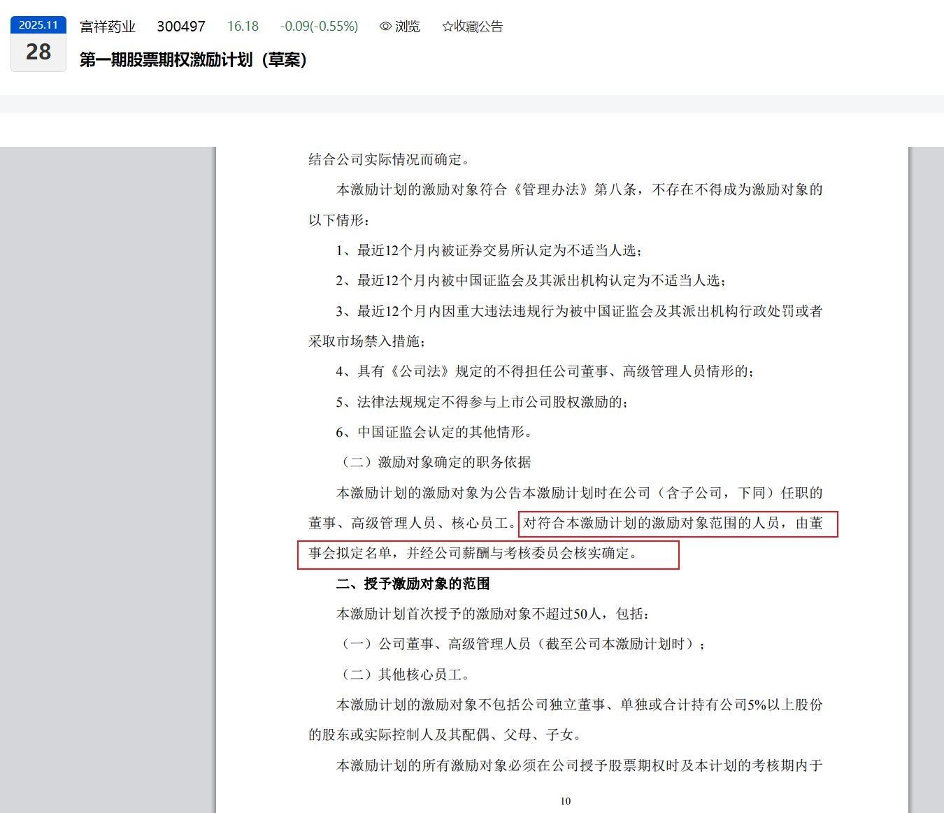 又要说了,股权激励不是核心员工才能参与吗?哎,看文章要看全,不是还有下半句话嘛。还是以富祥药业为例,激励草案中说,对符合激励计划的激励人员,由董事会拟定名单,并经公司薪酬与考核委员会核实确定。至于谁符合激励条件,董事会说了算!门口大爷在咱公司当了20年保安,就是核心员工,其他人能说啥?