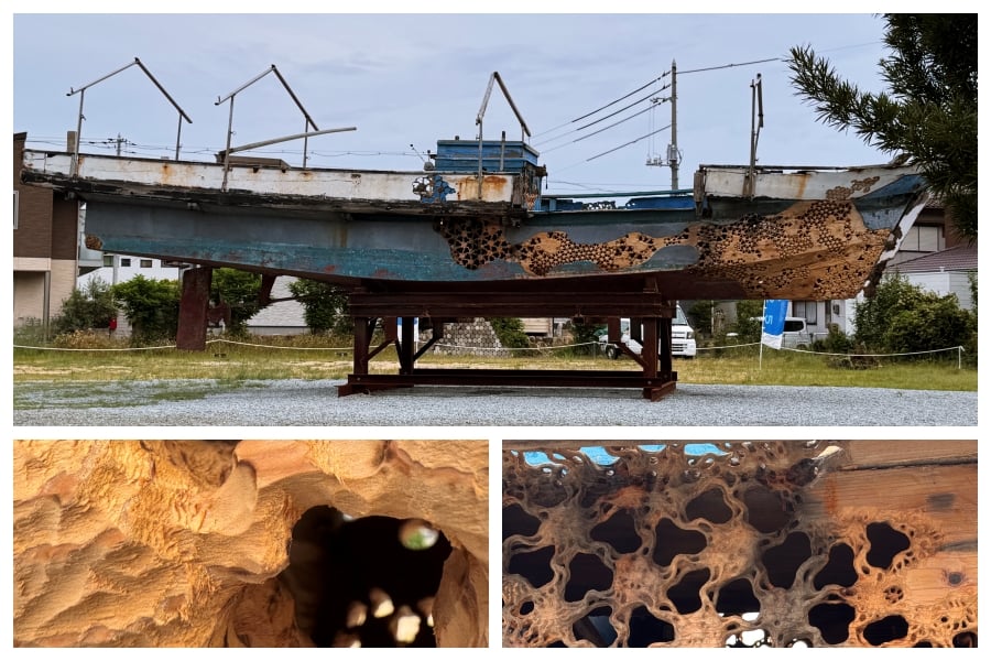这是一艘被雕刻过的大船。透过一个个小孔往里看会看到内部有光亮。有点让我想到精致的微缩玩具。同样是在悼念逝去的渔民时光,这艘船的外观还是值得观赏蛮久的。有种在看大型微缩场景的感觉。