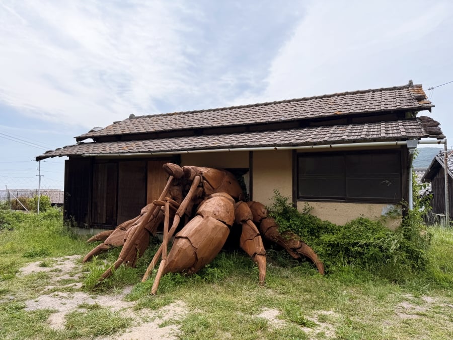 这是在小豆岛上看到的最惊艳的作品,因为我们需要从它背后的坡一路走上来。直到走到它面前才能看到它的全貌。一路上我们只能看到房子和脚,不少同行小伙伴开始猜测这是什么,有说甲虫的,也有说蟑螂的,结果一看,诶嘿是寄居蟹。