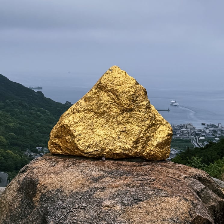 公路上的金色石头。讲的故事是原本大石头世世代代是神圣的象征,但是在现代开发中成为了障碍物,艺术家通过往大石头上贴金箔,将神圣的感觉再次拉回。