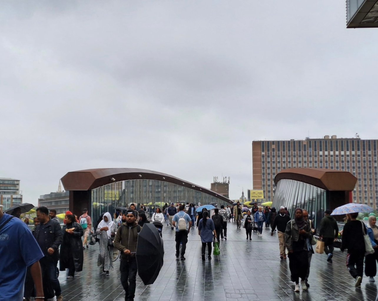 列車到達Stratford 後,迎來是一波波的人潮,作為香港人早上返工試過由紅磡地鐵站往另一月台步行時,就會見過早上香港人的上班步速,快,急,像在行軍。 我像一支針在人海中穿過,無人阻欄你的, 但你感到肩膀兩旁都被人不斷輕撞,終於到達對面月台。