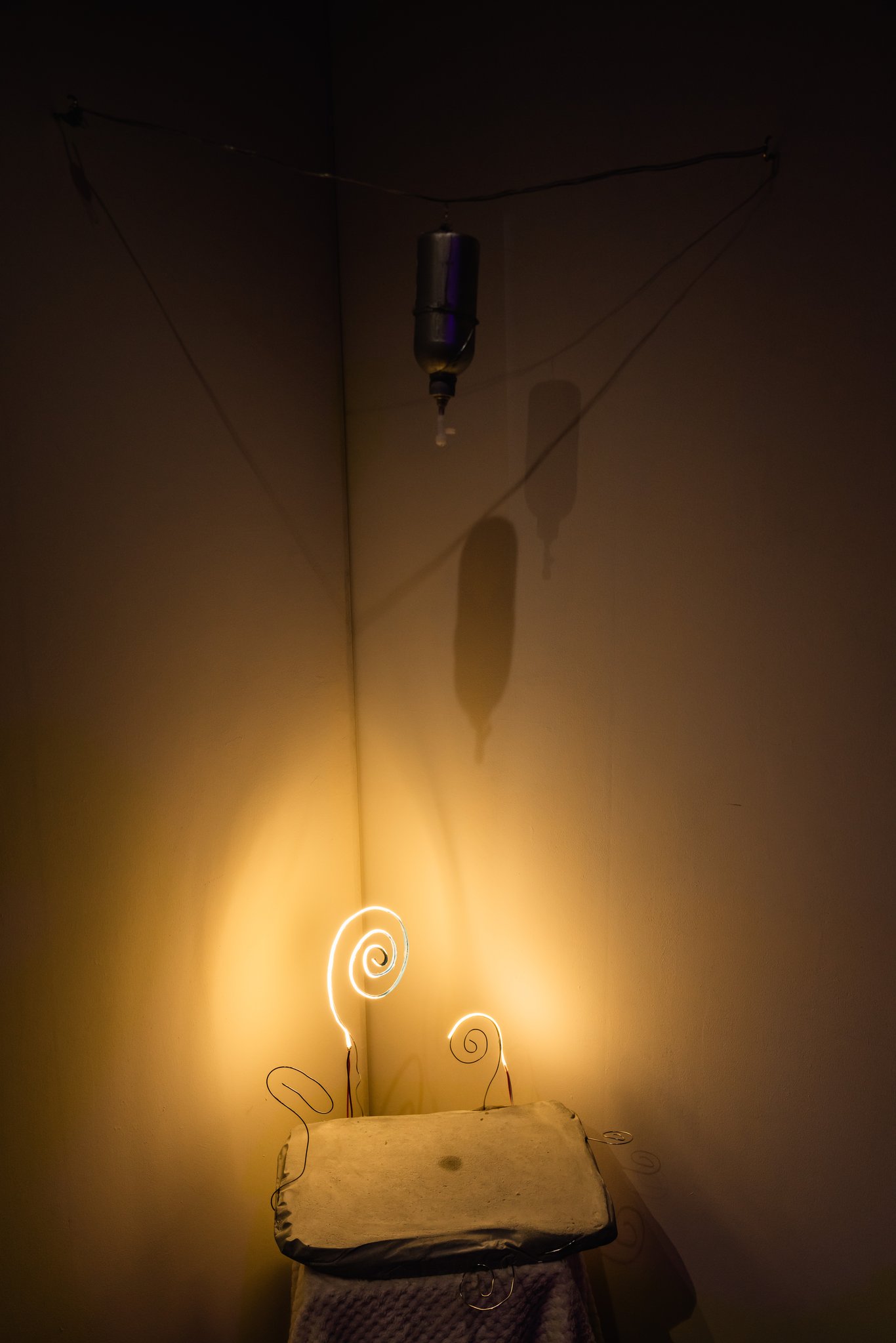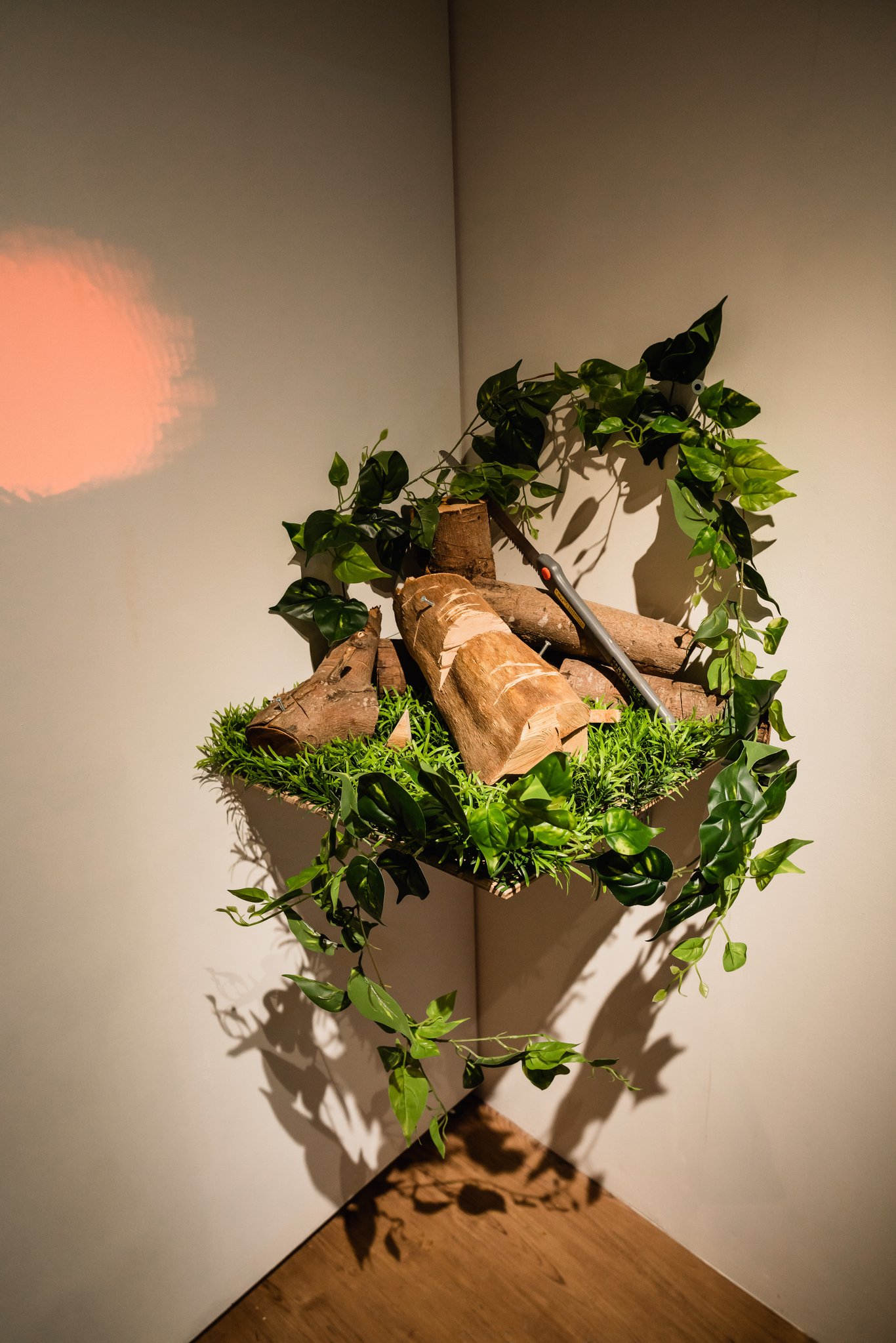 《I am because you are 我因你而存在》探討生命循環,透過花卉、人形與跳動的心臟等媒材表現循環概念。《Residual Dream zzZ》以水泥枕頭搭配液體裝置呈現夢境易逝的特性。《他一直流 Drippinggggg》運用 UV 燈照射 UV 膠滴落,象徵時間的痕跡。另有作品以立方體表現對資訊的解讀偏差,以及以鋸子置於樹木上呈現植物受損的聲響,而這些聲響藏得比較後面,需要觀眾花時間仔細聆聽才能發現。