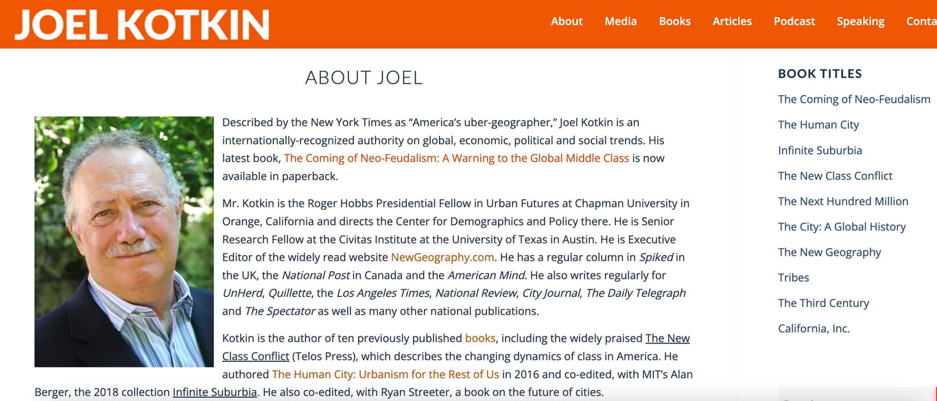另一个播客的主持人是查普曼大学教授周·考特金教授(Joel Kotkin)主持的播客“新封建主义未来” (joelkotkin.com/feuda...金教授的书《新封建主义的到来》出版于2020年,论述我们这个世界将怎样进入一个新的封建社会里。封建领主们将是科技寡头,这些人已经在掌控我们的经济未来,他们正在创造一个高科技的新封建社会,社会和经济不再进步,而是正在倒退,走向一种‘新封建主义“,强大的中产阶级正在被掏空,美国正在分裂成一小撮超级富有的寡头,严重损害中产阶级和工人阶级的民主权利,堵住了阶级流动的可能。