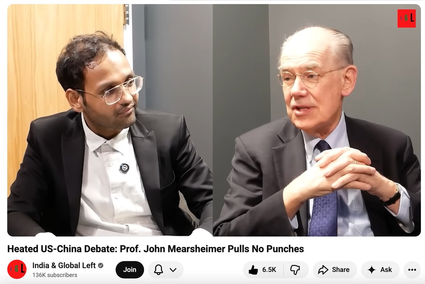 第三个常听播客是我2025年才发现的播客:”印度与全球左派“(India & Global Left):www.youtube.com/@Ind...。 该播客的主持人是印度左翼青年知识分子卓提施姆·穆迪亚(Jyotishman Mudiar), 他目前是芝加哥大学的博士研究生,原本是一名土木工程师,后来转行攻读历史学,并在尼赫鲁大学历史研究中心获得了历史学硕士学位,成绩优异,他拥有丰富的实地研究和档案研究经验,并精通定量数据分析和解读。他目前的研究兴趣集中在劳动力、资本和发展型国家的经济史,尤其关注印度、中国和美国。一位年轻学者,左翼学者,说话非常温和,问题却很有深度。我第一次听他的播客是他与约翰·米尔斯海默的对话《 关于美中的激烈辩论:约翰·米尔斯海默教授毫不留情地发表尖锐言论》(youtu.be/NV2FBf_cOg8...),约翰·米尔斯海默是世界上最出色的政治学者之一,他的理论即国际政治的“现实主义”,对大国崛起有自己独到的见解。他的理论对地缘政治研究影响很大,穆迪亚不同意他关于中国崛起的论述,他们之间的交锋极有深度。