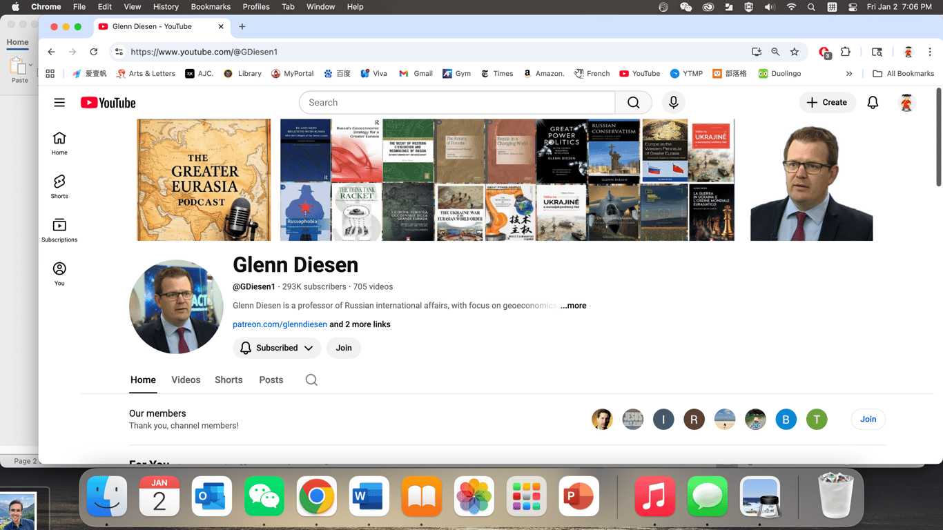 我第二个常听的播客是:www.youtube.com/@GDi..., 播主格兰·迪森教授(Glenn Diesen是瑞典东南大学政治学教授,他从专业上看是位研究俄国的专家,主要领域是俄罗斯政治经济、俄罗斯保守主义和俄罗斯环境政策。 我大概是从帕斯卡尔的播客里得知这个教授的,于是从2024年中开始听他的访谈节目。这两个节目访问的人有相当的重合,这两个自媒体在西方都不是主流的媒体,而是知识分子的个人媒体,他们邀请的人也大多都是比较边缘的声音。由于每天都是被主流媒体轰炸着,我渴望听到不同的声音。迪森教授讨论地缘政治的时候,很多观点会从俄国的角度出发,他和他的访谈者们对俄乌战争、巴以战争,中美较量的观察与分析与《纽约时报》的西方主流观点几乎是针锋相对的,为我提供新的思考的可能。迪森教授的频道现在也有27万左右的订户,可见影响不小。