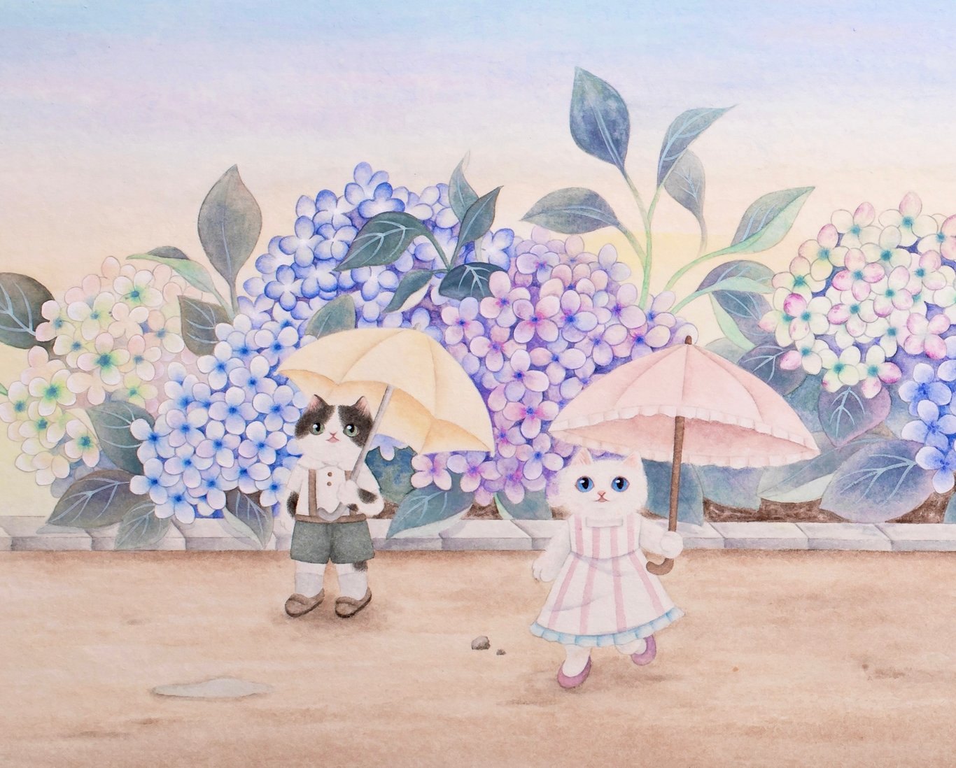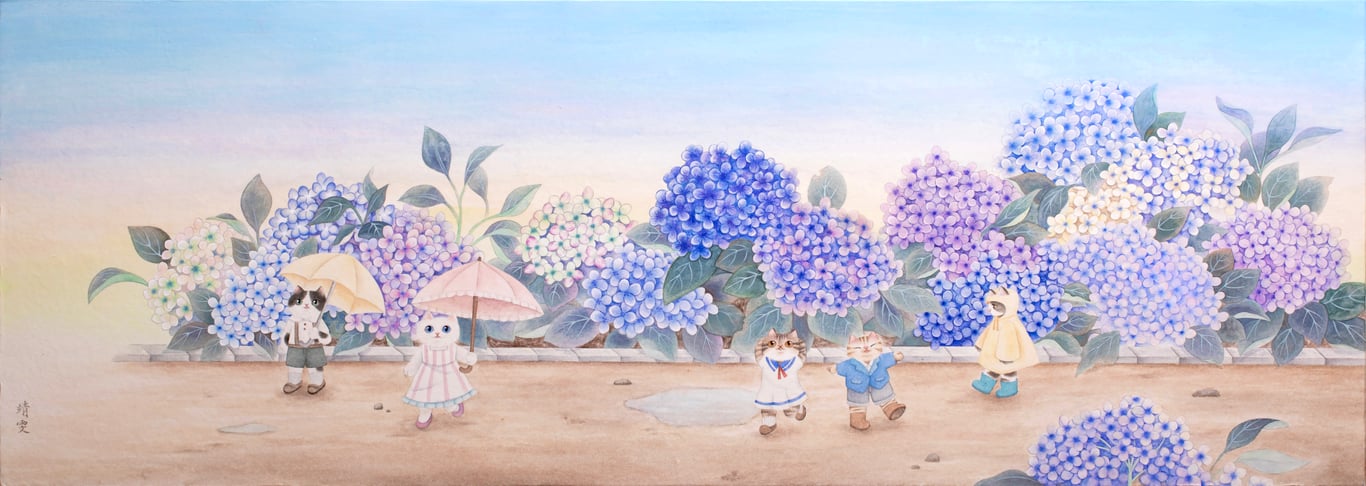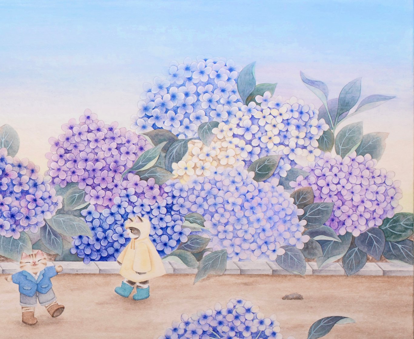 從以前就很喜歡藍紫色的色調,溫柔又療癒的顏色。去台東玩的時候在山上看到斑斕的繡球花,溫柔的色彩一直停在美好的回憶中,希望透過畫筆讓它永遠綻放。