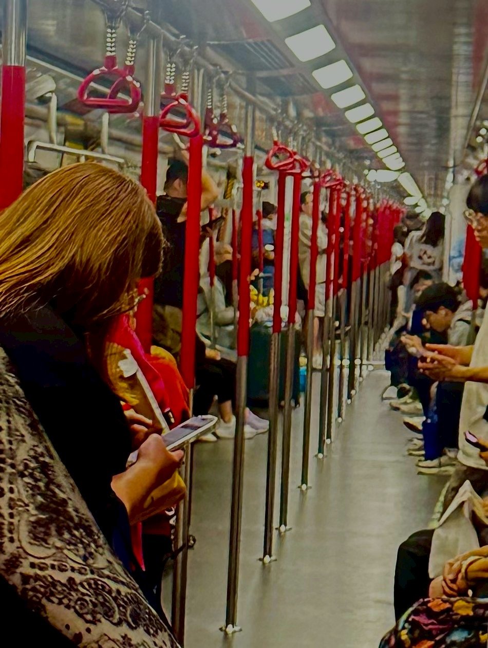 紅色扶手沿著車廂排列,垂落,像一行行不必解釋的規則,人們靠得很近,卻各自站穩,肩膀偶爾碰到,會立刻撤開。