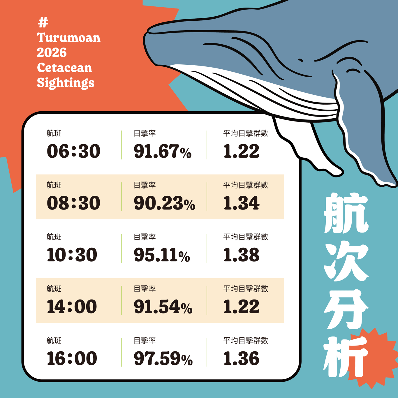2025 年,我們有94 趟航次裡遇見牠們,出現機率高達 12.48%。