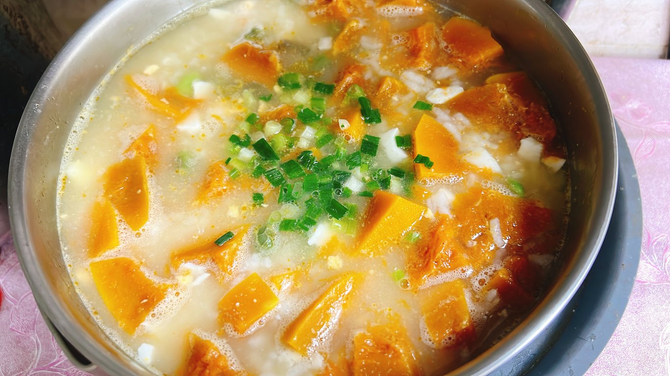 菜攤上常見的南瓜,有一陣子竟然出現好幾顆,只能變個辦法吃南瓜。南瓜最好是連皮一起吃,蒸著吃的話是如此,但做南瓜泥或煮粥就得削皮。簡單的一鍋熱粥,一入口就感覺溫暖,搭配簡單的蔬菜清炒或小菜,身心舒暢。