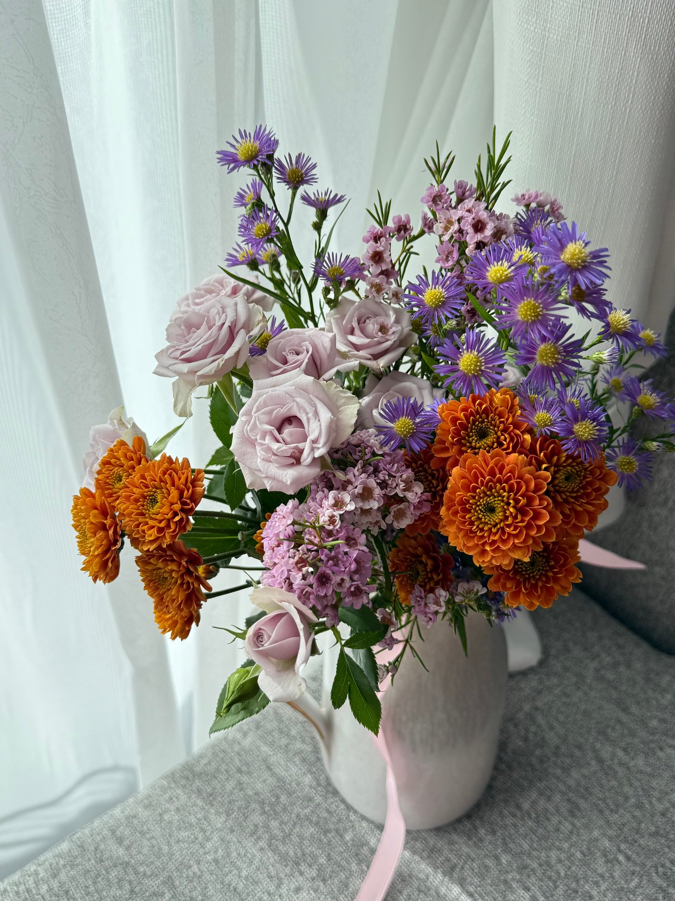 看了友人的插花,小小的聊了各自近況,她說工作忙到沒有靈魂,突然覺得不行,開始報名插花課程,開始上課之後,覺得自己活了過來。我們聊老傢俱,聊木頭桌子的質感,聊了最近她在刷油漆覺得自己上了年紀,我說著我的白頭髮跟掉髮危機,從年紀又聊回了花,我傳了黃菊花給她,她說好像裝滿了陽光,就這樣她說著要去拯救塞在包包裡的花,說著自己會再繼續上課,感覺自己活過來了。