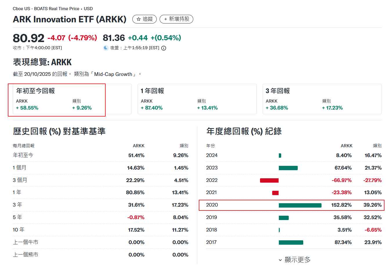 2017年,ARKK取得了87.4%的惊人回报。但那时基金规模仅1.16亿美元。
