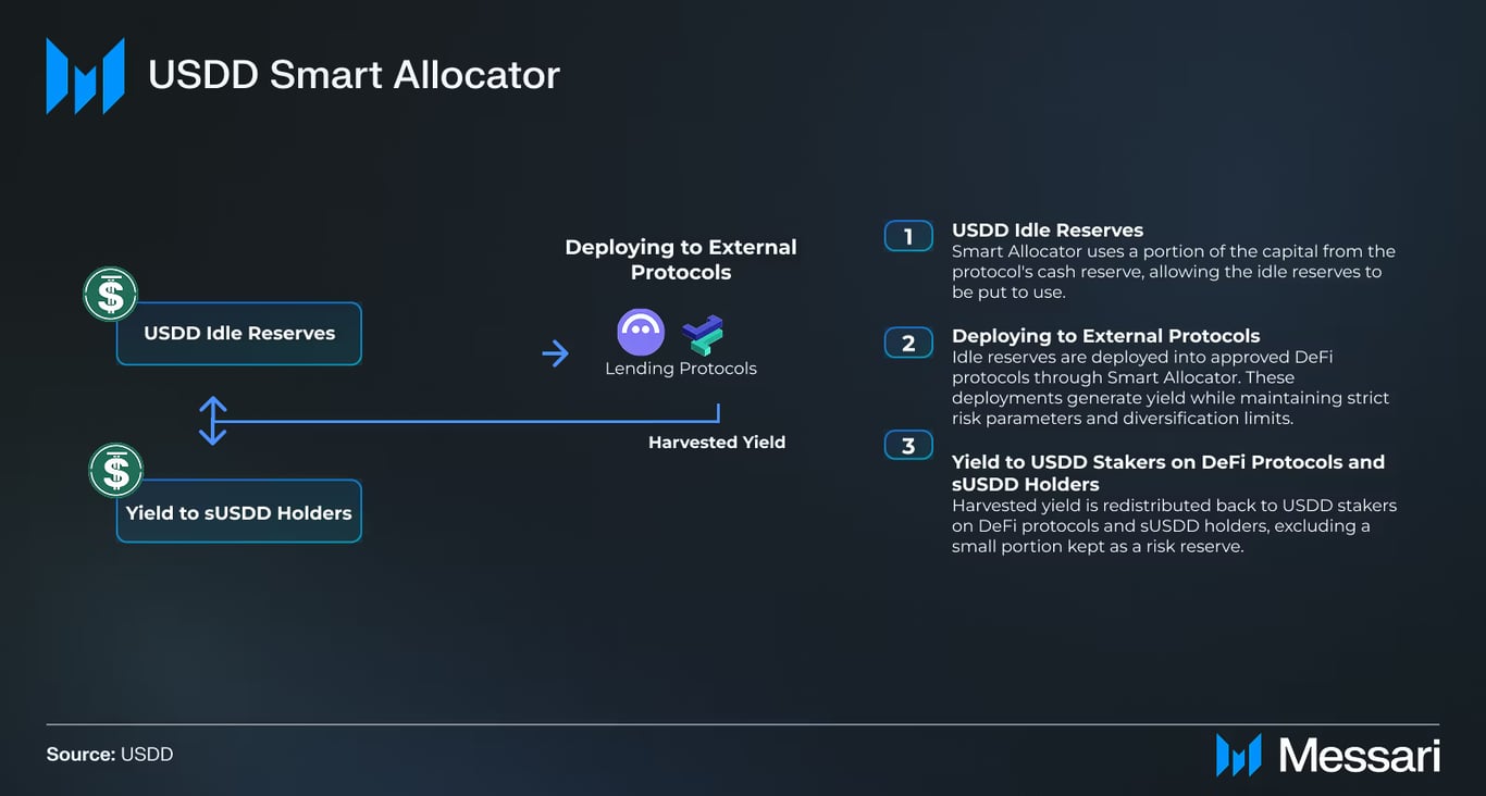 2025 年 6 月,USDD 推出 Smart Allocator,利用闲置储备金赚取真实收益反哺用户,截至目前 Smart Allocator 累计收益超 900 万美元;