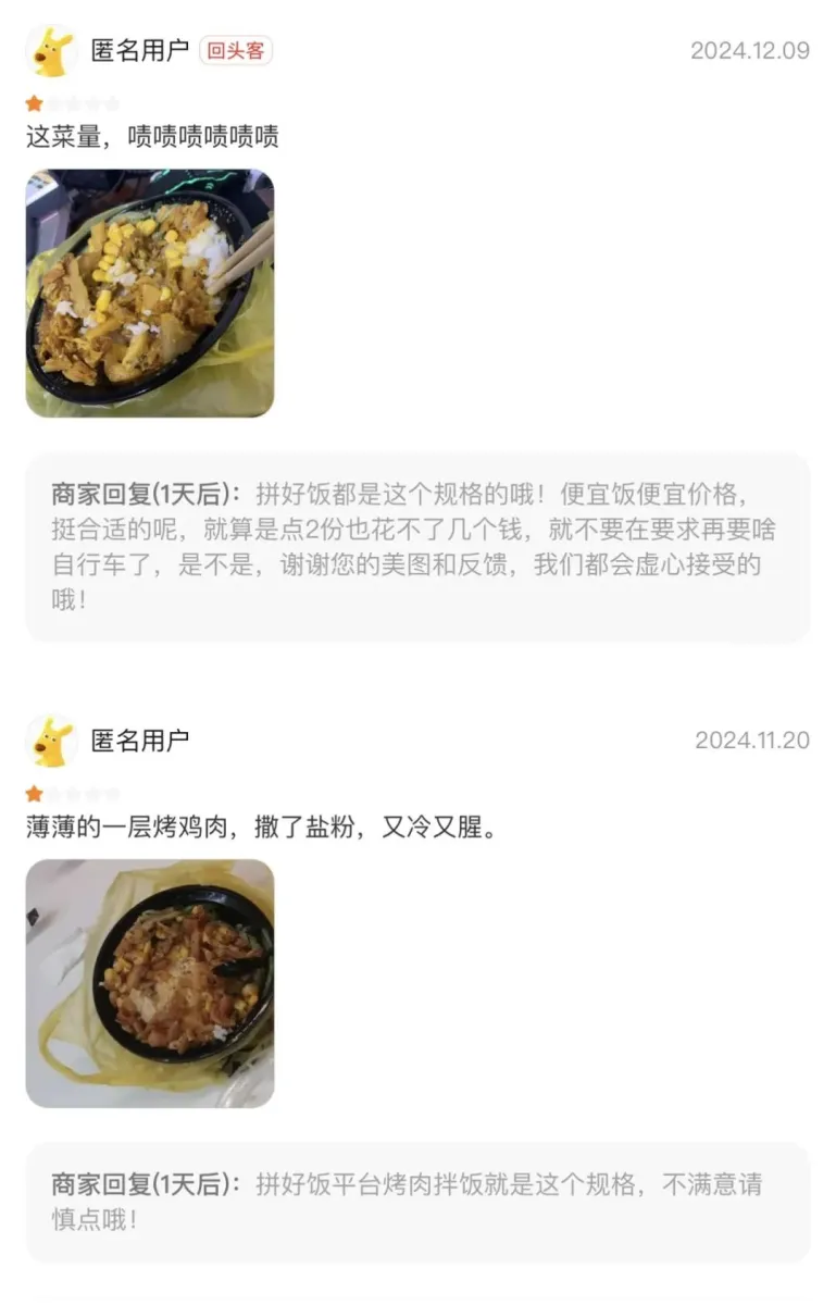 我曾经看到一位厨师在B站点评“拼好饭”时这样说:“年轻人们听我一句劝,别点了,为你们好也为我们厨师好,现在我们店里都没几样新鲜食材了,我们都被美团逼得没菜吃了!”