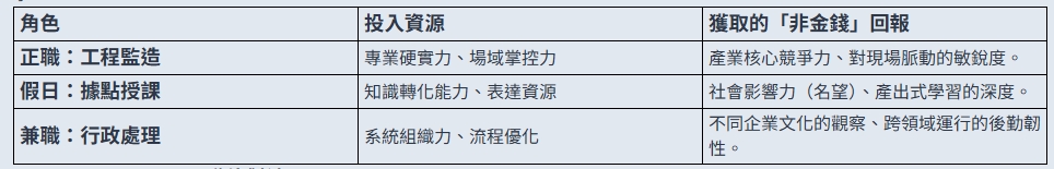 這不只是斜槓,而是一種職能對沖。正職練深度,授課練廣度,行政練細緻度。當別人在計算加班費時,我是在不同的場景中,利用他人的資源完成自我的多次迭代。