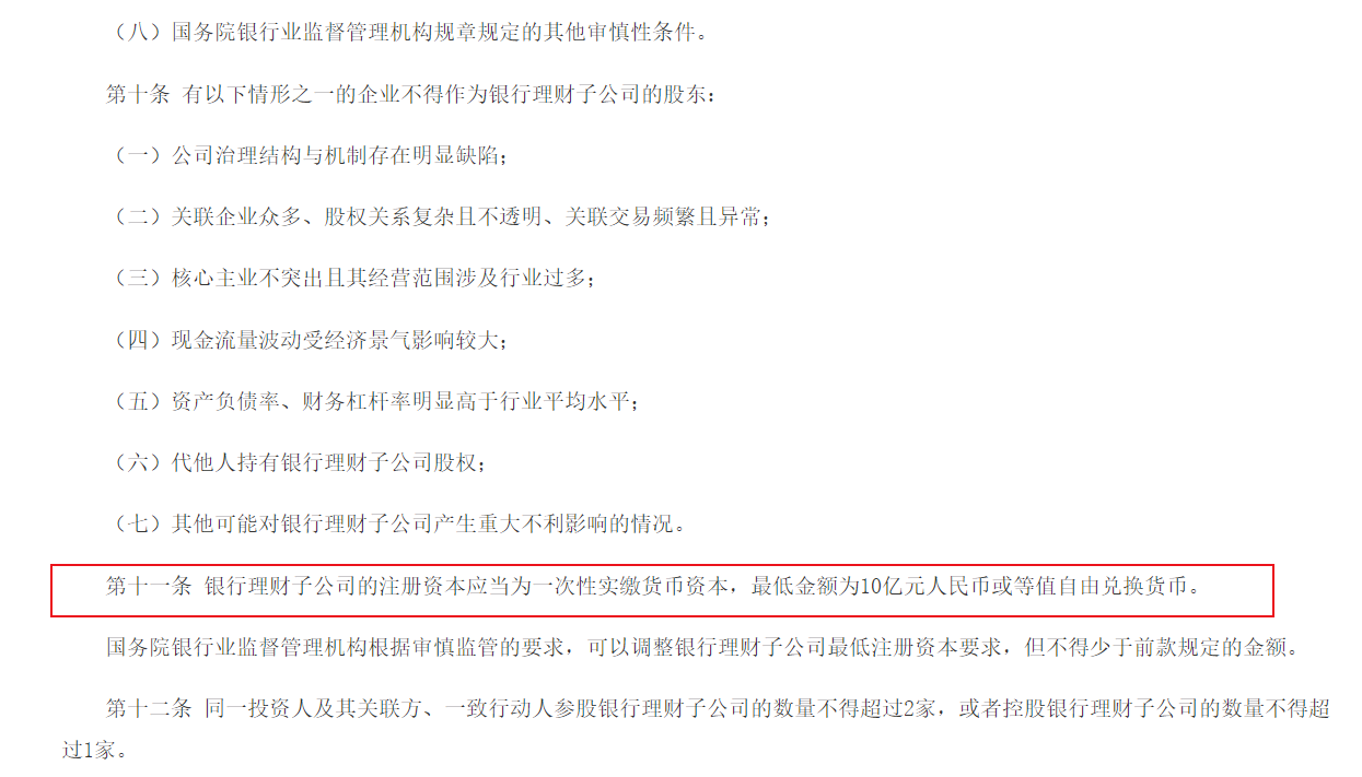 根据银保监会发布的《商业银行理财子公司管理办法》,银行理财子公司的注册资本应当为一次性实缴货币资本,最低金额为10亿元人民币或等值自由兑换货币。