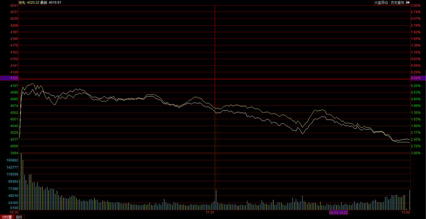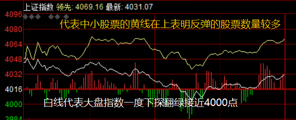 周一上证指数大跌之后,夜盘美股三大指数一起反弹,而周二日韩股市也一起大幅反弹3.5-5%之多,A股在全球反弹的带动下早盘反弹到4049,之后回落到40002点,回踩了4000点后午盘再度小幅反弹到4031点。整体反弹的幅度还不大,好在代表大多数个股的黄线指数在白线指数之上,个股反弹数量较多超过4000只,但反弹的幅度并不大: