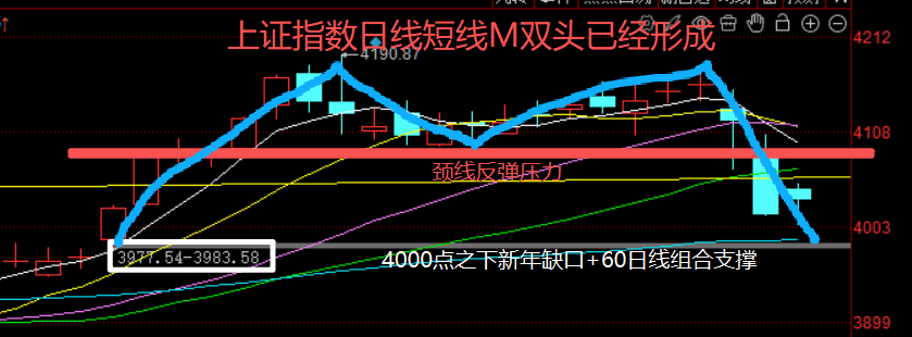我们看到,短线已经形成了M双头走势,大盘第一个高点4190附近,第二个高点在4170附近,平均4180,而M头颈线在1月中旬的回踩低点4080附近,目前已经跌破。