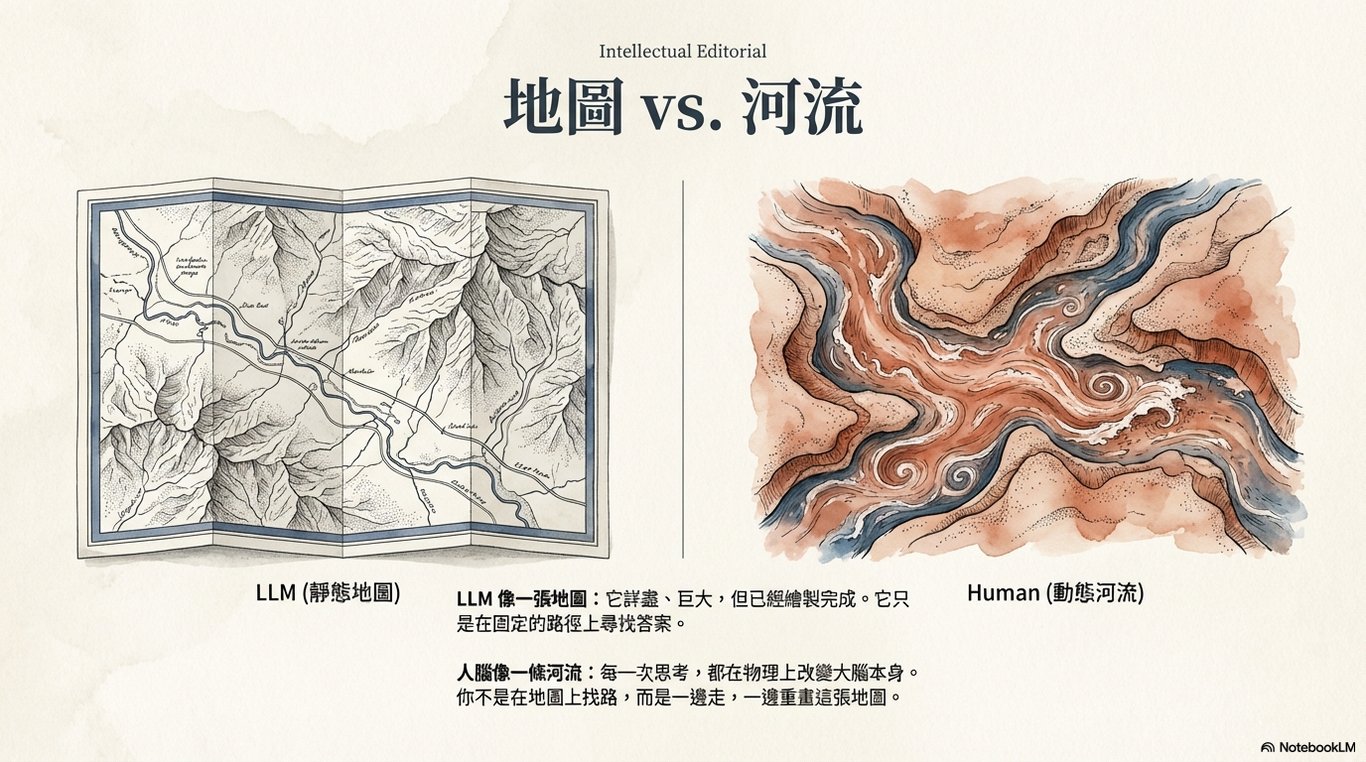 核心區別在於「靜態」與「動態」 目前的 LLM 是一個功能固定的「靜態系統」(像一張地圖),其本體在訓練後就不再改變。而人腦則是一個不斷透過經驗自我改造的「動態過程」(像一條河流)。