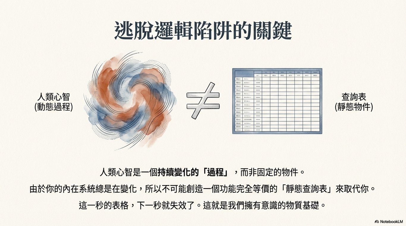 人類心智是一個無法被靜態查詢表完全替代的、持續變化的「過程」。