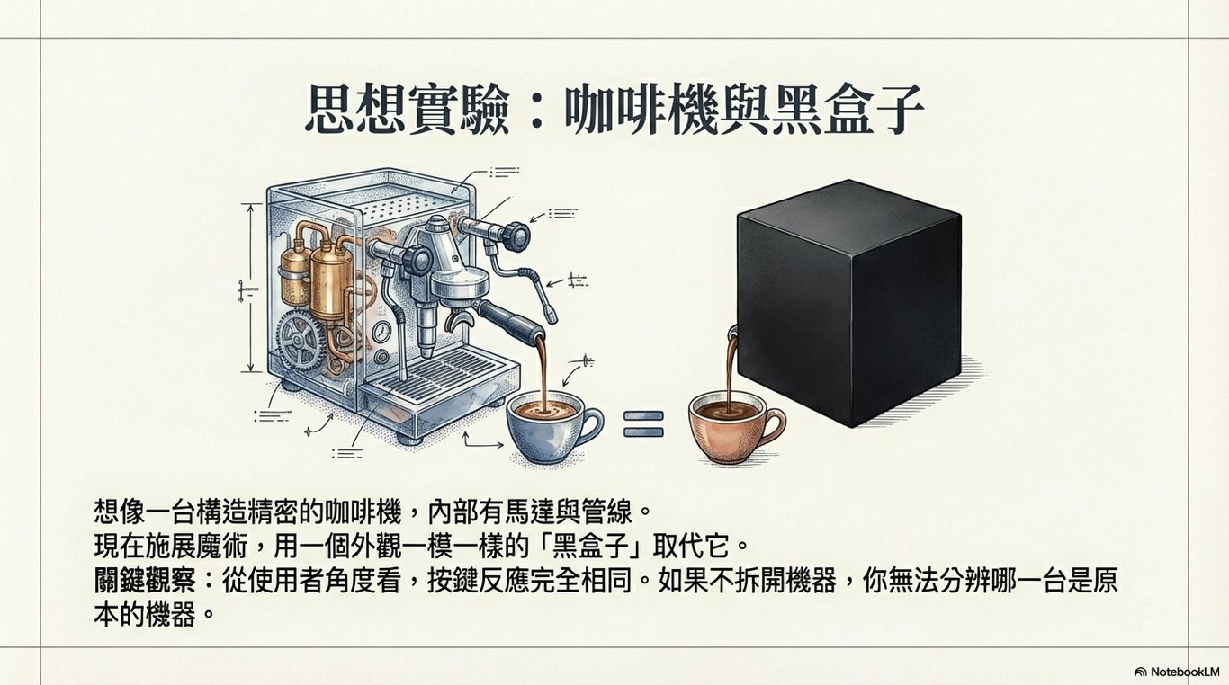 這個比喻的核心是:從使用者的角度來看,這兩台機器的功能和表現完全無法區分,即使它們的內部原理有天壤之別。