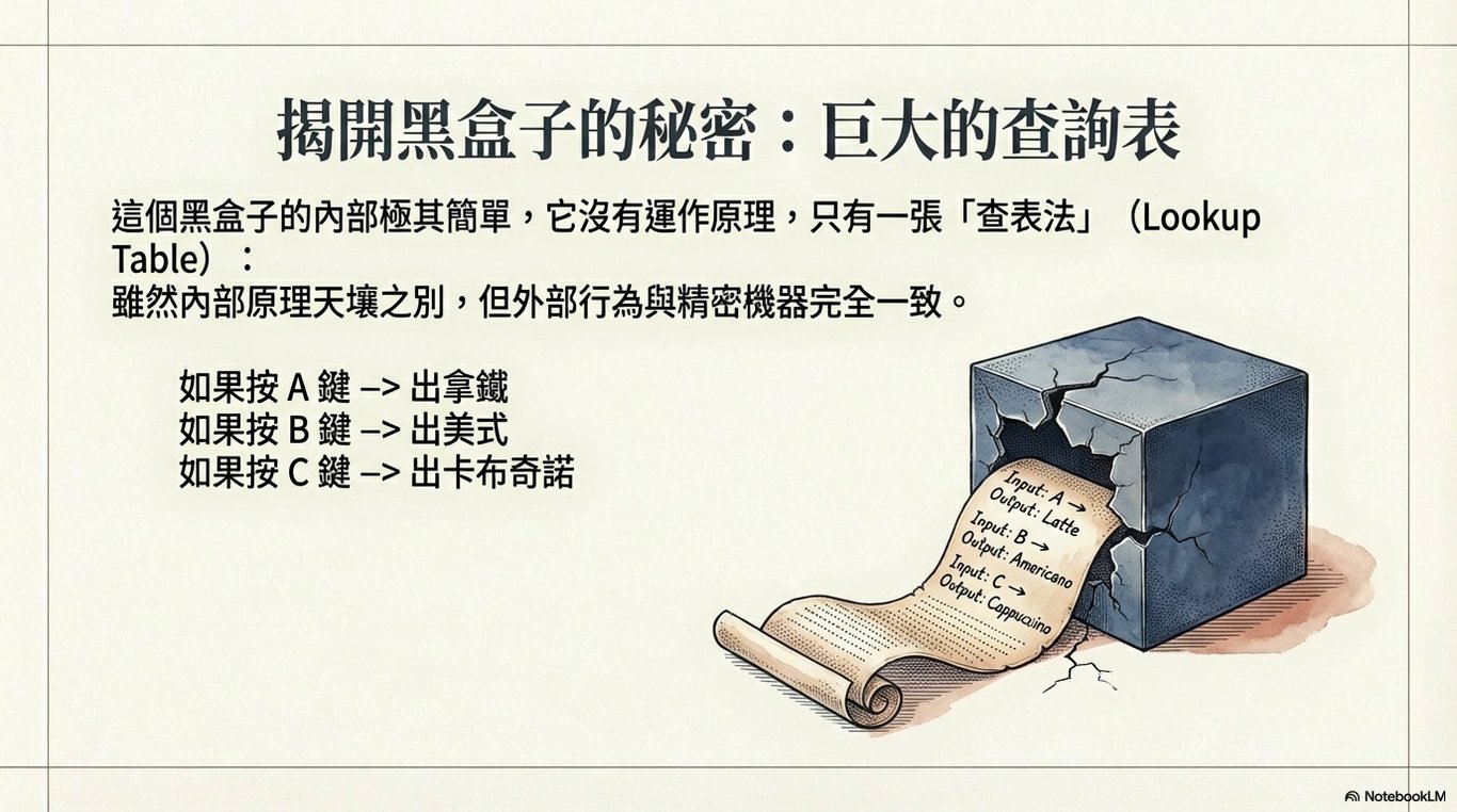 現在,我們施展一個「魔術」,用一個外觀一模一樣的「黑盒子」把它換掉。這個黑盒子的行為與原本的咖啡機完全相同,但它的內部構造卻極其簡單:只是一張巨大的查詢表(Lookup Table)。