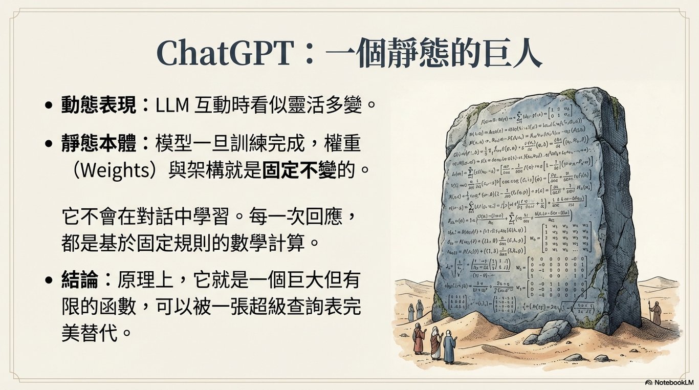 靜態本體:然而,一旦模型訓練完成,它的權重(weights)和架構(architecture)就是固定不變的。它不會因為與你對話而真正地學習或改變自己。每一次的回應,都只是基於固定的內部規則,對你輸入的文字進行一次複雜的數學「計算」。