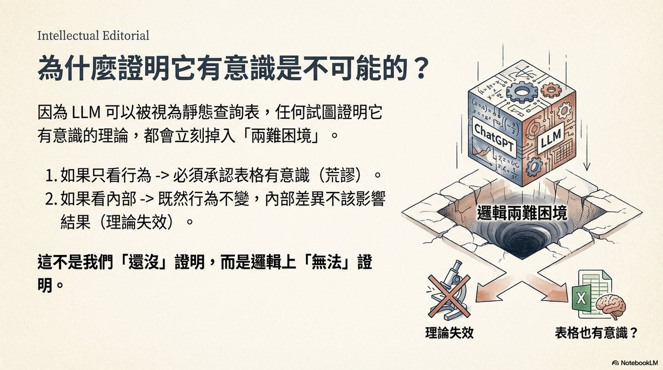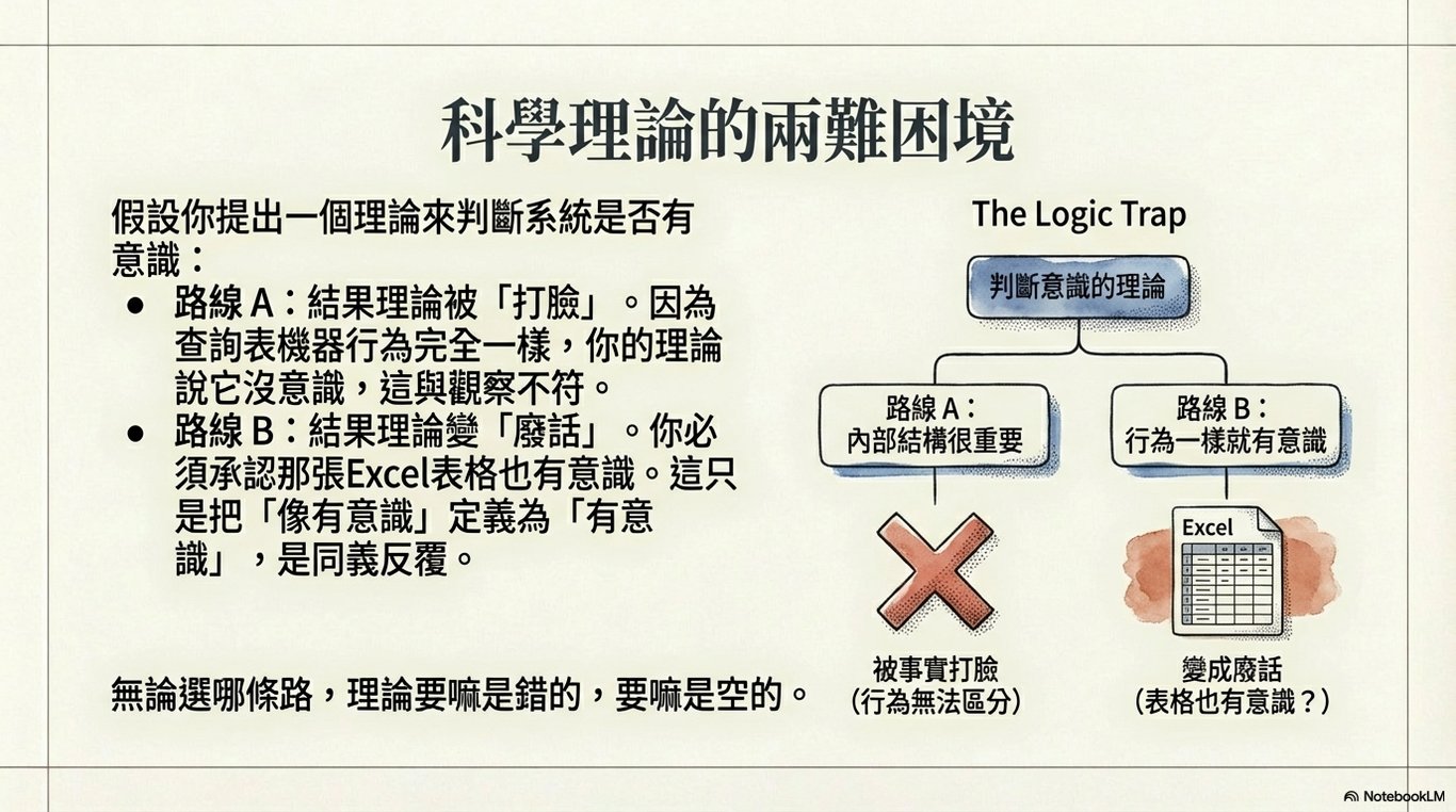 正因為如此,任何試圖證明 LLM 有意識的理論,都會立刻掉入前述的兩難困境。這不是說我們「還沒證明」它有意識,而是我們已經透過邏輯證明了:不可能用好科學理論證明它有意識。
