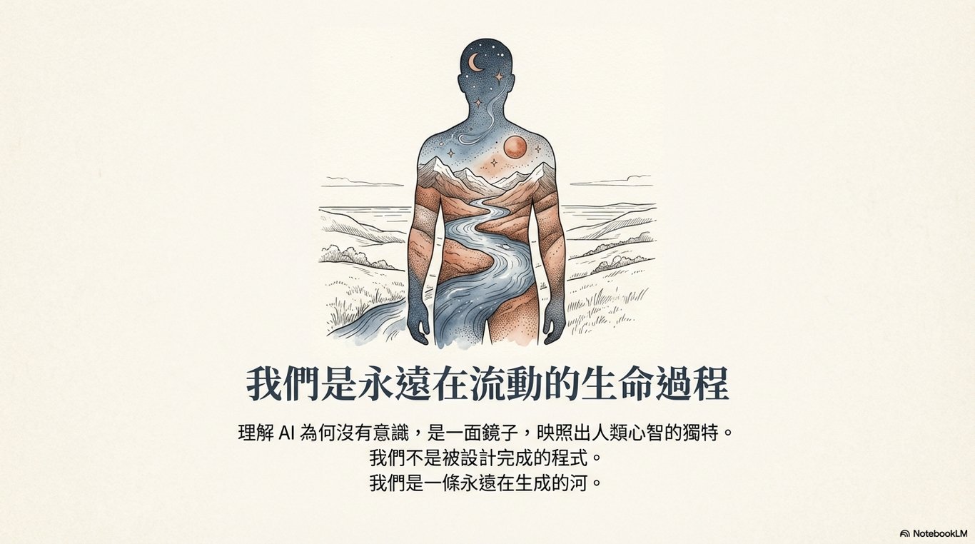 最終,理解 LLM 為何沒有意識,不僅解答了一個當下的科技疑問,更深刻地映照出人類心智的獨特之處:我們不是被設計完成的程式,而是永遠在流動、永遠在生成的生命過程。