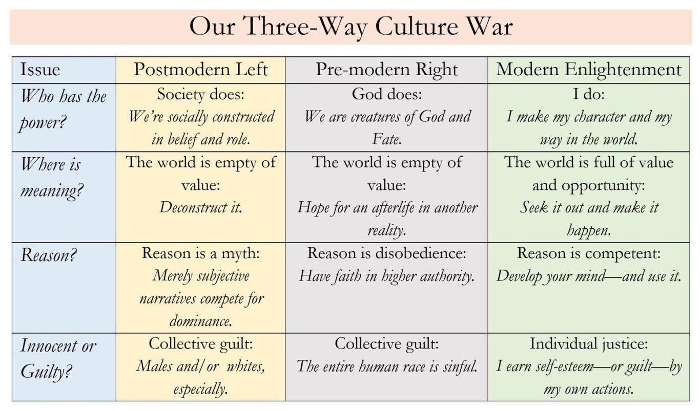 總而言之,我的論點是:政治認同源於更深層次的自我哲學,這些哲學在至少三種主要的政治立場中有所不同,即保守主義、自由主義和左翼(自由意志主義者通常被放在附錄中)。 我堅持認為,那些明確地屬於這三種主要政治陣營的人,至少部分原因是他們首先以相應的方式理解自己。 也就是說,保守派之所以是保守派,是因為他們相信自我本身是一種「傳承的自我」; 自由主義者之所以是自由主義者,是因為他們相信自我本身是一種「發現的自我」; 而左翼人士之所以是左翼人士,是因為他們相信自我本身是一種「自我定義的自我」。