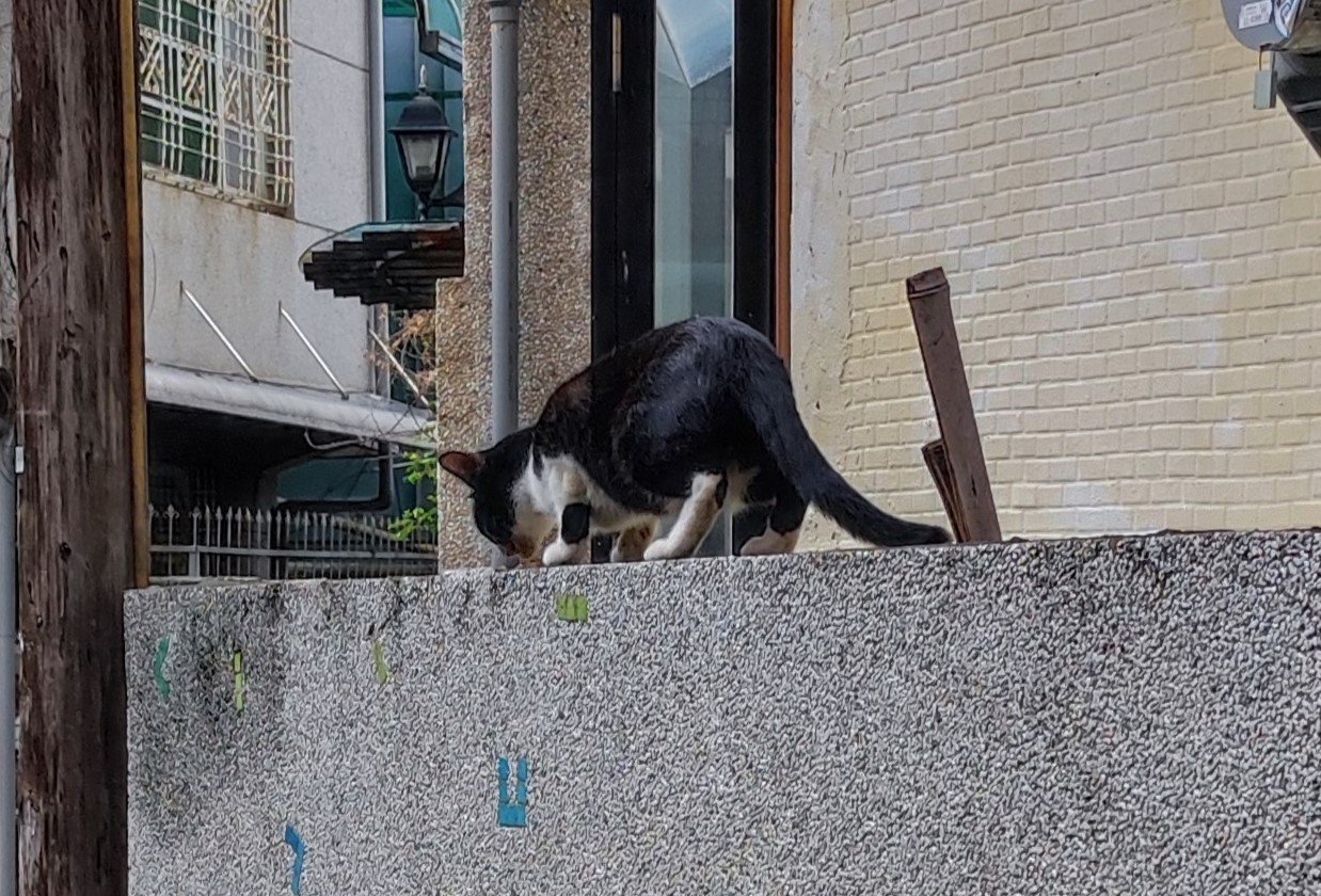 眼睛圓滾滾小黑白剛好在圍牆上,一邊跟牠說在那等我別下來,一邊飛快停車找點心,期間眼睛圓滾滾小黑白在圍牆上一邊咪一邊走來走去。