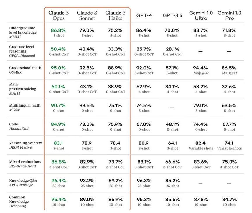 上圖展示了不同自然語言處理模型在各種基準測試任務上的表現成績。左側三欄展現了 Claude 3 系列模型在多個任務上的優異成績,包括大學程度的推理、數學和程式碼編寫等。值得一提的是,Claude 3 在大學入學知識測驗和一般知識測驗中都有接近或超過 95% 的高分,展現出其卓越的知識理解能力。