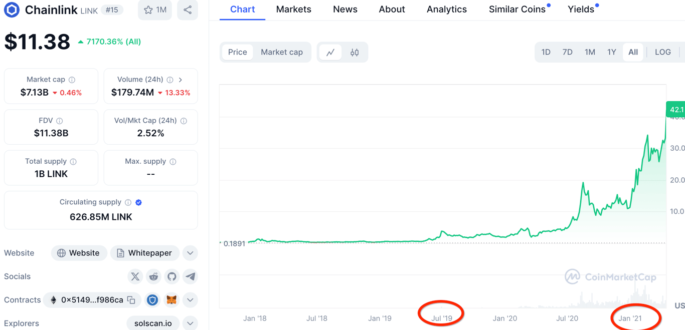 这一坚持带来了远超预期的回报。2020年,Chainlink爆发,币价飙升至20美元以上。朋友不仅没抛售,反而分批加仓。当币价突破30美元时,他选择套现。粗略估算,仅Chainlink这一笔投资就净赚近500万美元,从不足1美元的成本获得30多倍回报,这个小币种成了他财富的跳板。