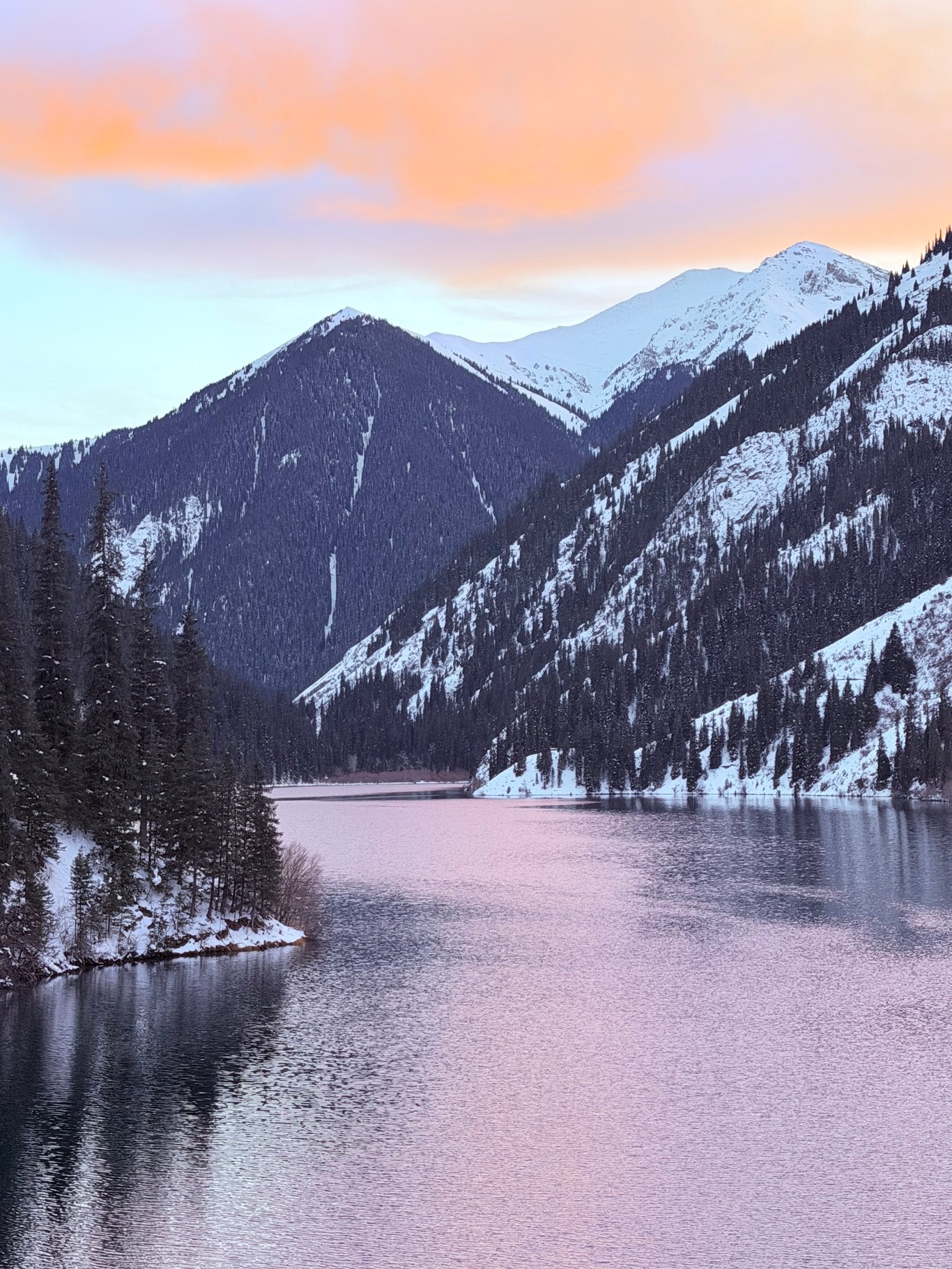 午后转进山里去看两处高山湖。先到凯恩迪湖,湖面发着冷蓝的光,水下沉着一片“站立的森林”,那地震留下的遗痕像停在时间里的手指。湖岸的雪很脆,我试着把手套摘下来拍照,指尖在风里像被细针戳,按快门的那一下,指尖跟着紧了一紧。呼出去的白气在阳光里散开,像一层薄雪刚被风抹平。再往前是科尔赛湖,三连湖中的这一湖半结着冰,反射着浅浅的天色,四周的针叶林一动不动,像一幅被冬天按住的素描。导游说它们是“天山的珍珠”,我更愿意把它们当成“时间的眼睛”:不催不赶,看着你来,目送你走。这里确实会让人误以为到了瑞士——清、冷、干净——但瑞士是被设计好的秩序,这里的秩序来自自然的耐心。