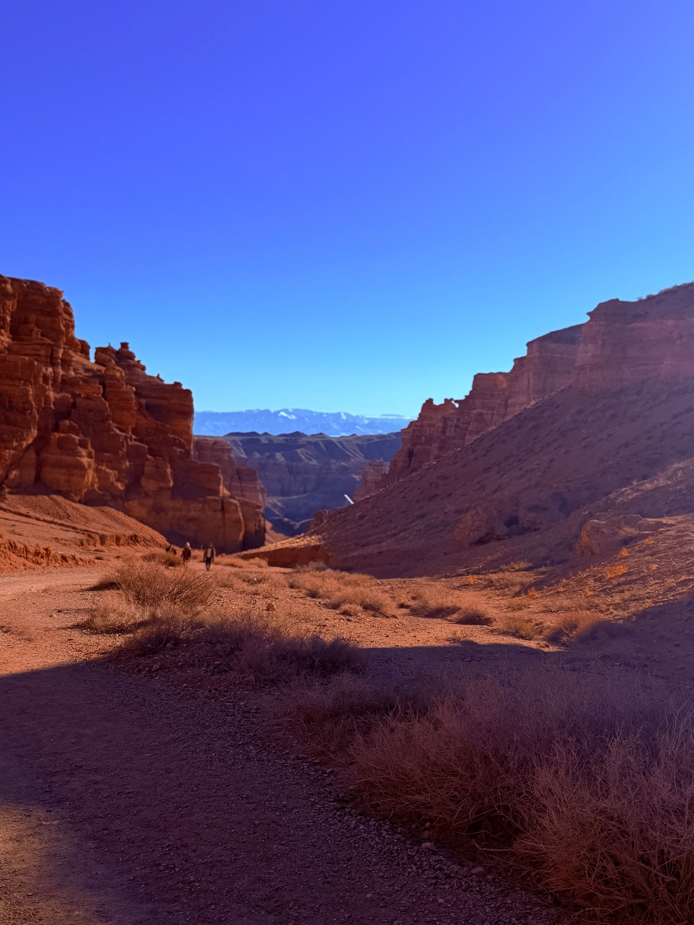又是清晨,从城里出发,车头向东南。路两旁的坡地被雪压低,偶尔有木屋冒着细细的白气。第一站是奇伦大峡谷(Charyn),也有人叫恰伦或“加勒”峡谷。赭红色的岩壁被风刻成层层纹理,阳光沿着缝隙滑下去,从明黄走到紫灰,像被看不见的手缓缓调暗。我站在边缘想起约旦的佩特拉:那里是被人凿出的红,这里是被风雕的红;一个属于文明,一个属于孤独。风从谷底往上走,夹着细沙拍在脸上,像是在提醒你:时间并不毁灭,它只是在不同地方换不同的刻刀。