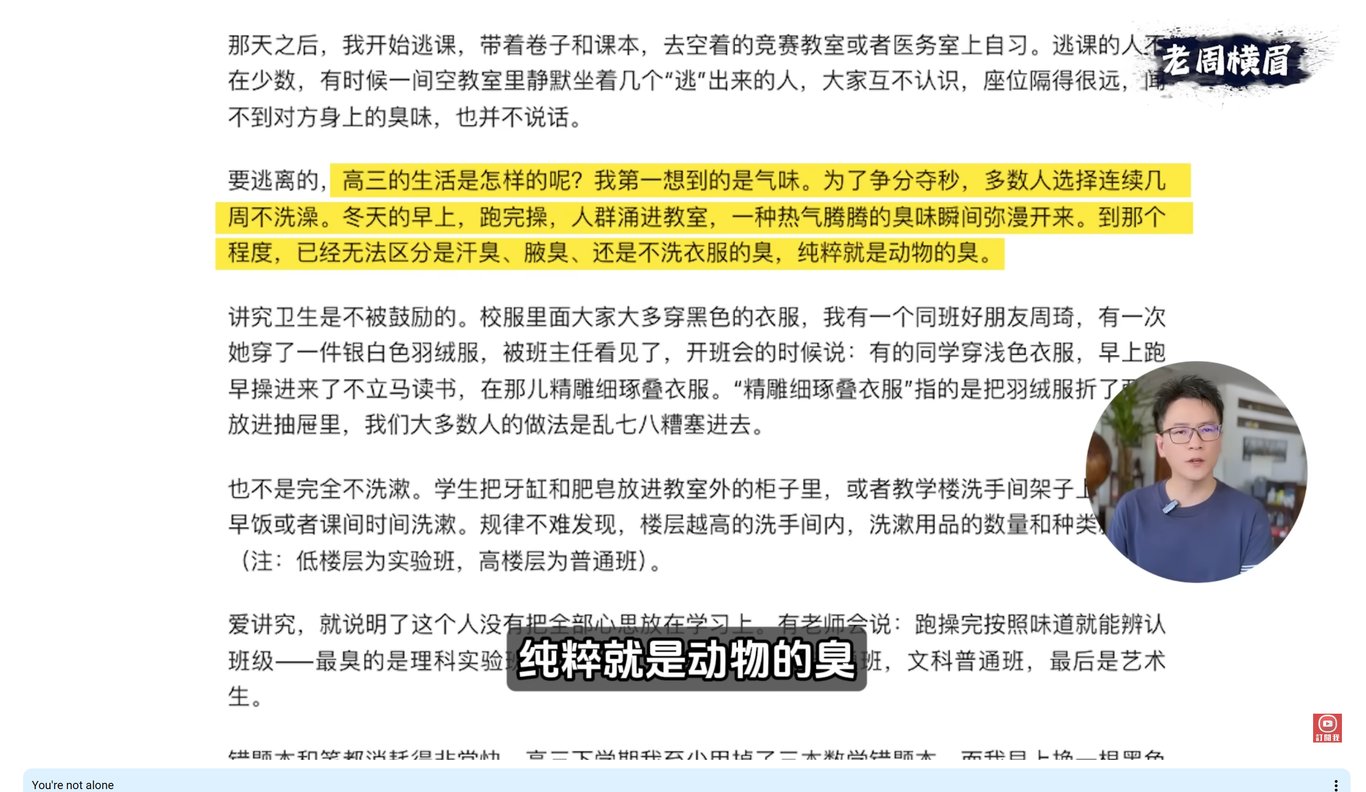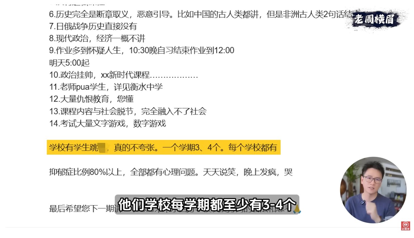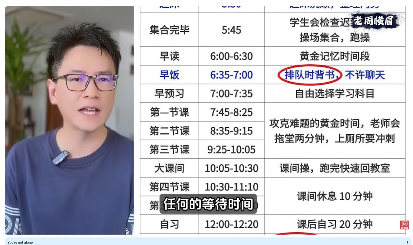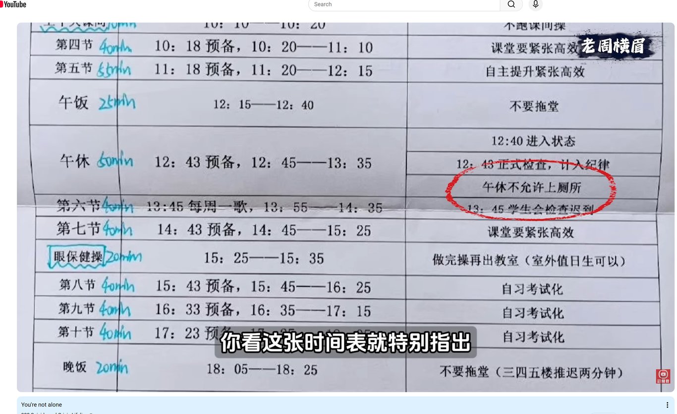 老周在這裡面總結還可以。他說這個為什麼要這麼做,是因為不想改。那麼,為什麼不想改呢?是因為這套東西確實是按照他們的需求培養出了崇拜權威、會揣摩、服從性強、沒有自己思想的聽話的、具有高度奴性的工具人。 聽話二字可以總結。聽話,為了培養聽話的“工具人”,而打造了一個煉獄。為什麼古代的時候要講究尊師重道?為什麼對老師不能得罪?為什麼不管是任何人對老師也要表現得畢恭畢敬?當然,現在不會了。現在如果說你家裡有人的話,老師是會反過來對你的孩子畢恭畢敬。 老週提出:為什麼這個老師違法也會大事化小,小事化了? 盡量不公開處理呢。 老朱說得非常對,因為老師代表著權威。他是權威的話,生他是為了讓這些人從小就習慣受權威的約束管控,而不去質疑、不去反抗。也就是說,是一種軍事化的服從性的訓練。而這種軍事化的服從性的訓練是有意為之。而且,我們看這一期前面這個老周說到的這些信件,也好,還有就是這種學生的表述,也好,以及具體的就是規定的詳細的表格,也好,都是讓你連上廁所都沒有時間。這些已經超越了所謂的軍事化訓練和那個監獄式的訓練,甚至是超越了集中營的訓練。因為它是全天候24小時無死角的互相監督監控,而且是以犧牲健康為代價,以犧牲身心健康為代價的有意識的行為。 每一次的反抗都會得到負面回饋,從家長到環境都是加倍懲罰。一旦要去反抗,一旦要去質疑,就會被各種打壓、羞辱、體罰。其他地方的軍事化訓練是不是還是這樣模式喃?天不亮開始跑操,喊口號,沒有個人的生活,沒有隱私,沒有個人的享樂,沒有個人的想法,沒有個人的思想。就這一系列的所謂軍事化的訓練,真的是全世界統一的標準和模式嗎?当然肯定不是這樣子的。其實,說到底,這就是一種思想控制的行為。 商鞅五術的變體,讓你沒有時間去做除了規定以外的事。 最重要的就是在你可以形成自己的主體性和個人意識之前,首先就把這種奴性給深刻地植入了。 老周說到,他收到的信件中,80%都提到了學校嚴禁看課外書。 但是可怕如肖生剋的救贖裡的監獄中也是有圖書館可以看課外書的。因為看多了書,會對自由產生嚮往,想去外面看看,想要自己思考,想要創作。而這個正是這些人想要去除的人性的部分。 老周說到,你期待一個極權的地方,然後賦予你自由和思想。這是不可能的。它也絕對不可能做到的。