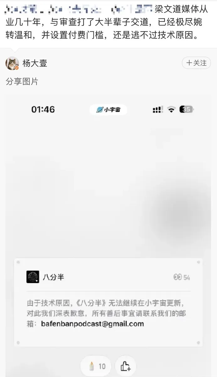 紧接着,同年8月19日晚,梁文道付费播客《八分半》下架,播放量和评论清零。制作方称因“技术原因”无法继续更新。听众们揣测是因为7月2日的节目“人们为什么如此怀念蔡澜”踩到了审查红线。道长在这期节目中提及他曾在《苹果日报》撰文,并感激当时社长董桥和老板“Jimmy”的宽容。