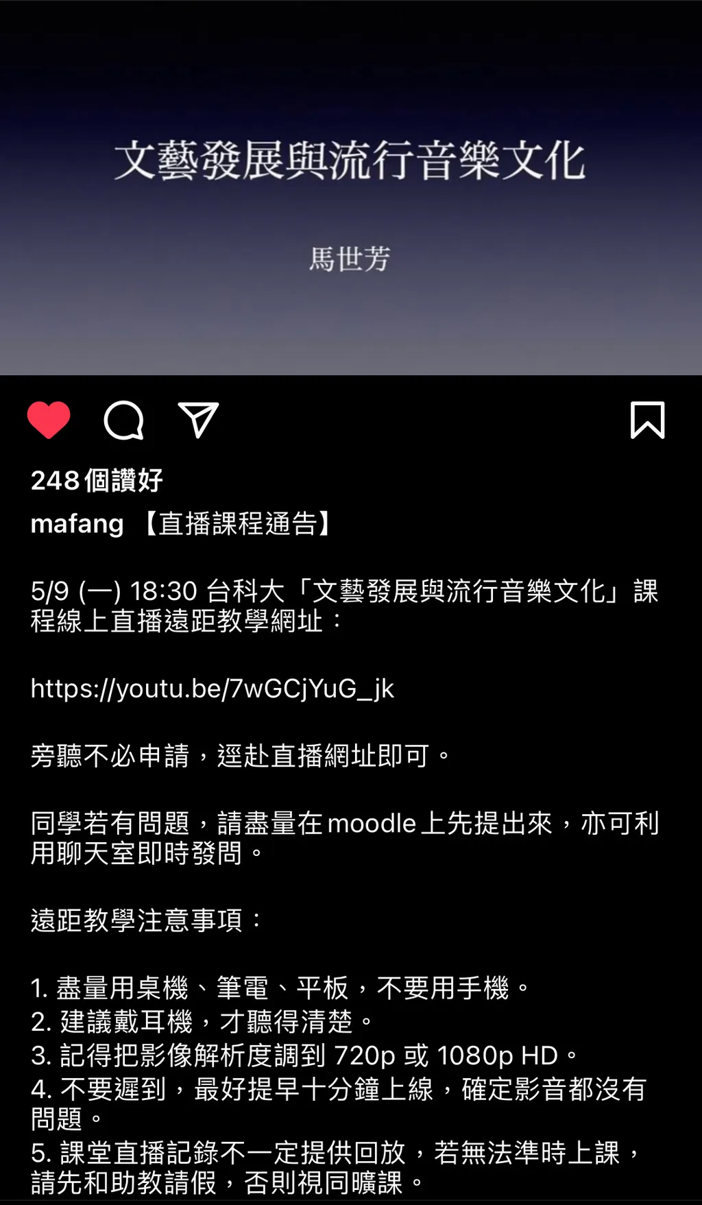 2022年,马世芳在台湾科技大学教授《文艺发展与流行音乐文化》,因为疫情的缘故这门课未能线上授课,他选择将这学期的课全程在YouTube上直播。因此我幸运地当了一学期台科大的旁听生,在这堂课上,我了解到他的另外两档电台节目:《音乐五四三》(2002-2017,news98)《耳朵借我》(2017-2020,alian原住民族广播电台),老节目的声音是lo-fi,马芳不紧不慢地讲崔健、陈升、罗大佑、李泰祥、周云蓬……那时恰逢上海“四月之声”,而这些节目恰好如雪中送炭般给了我关怀,我只用纯粹地欣赏音乐,不需要理会“摆烂”“非必要不XX”“润”这般的社会气氛。