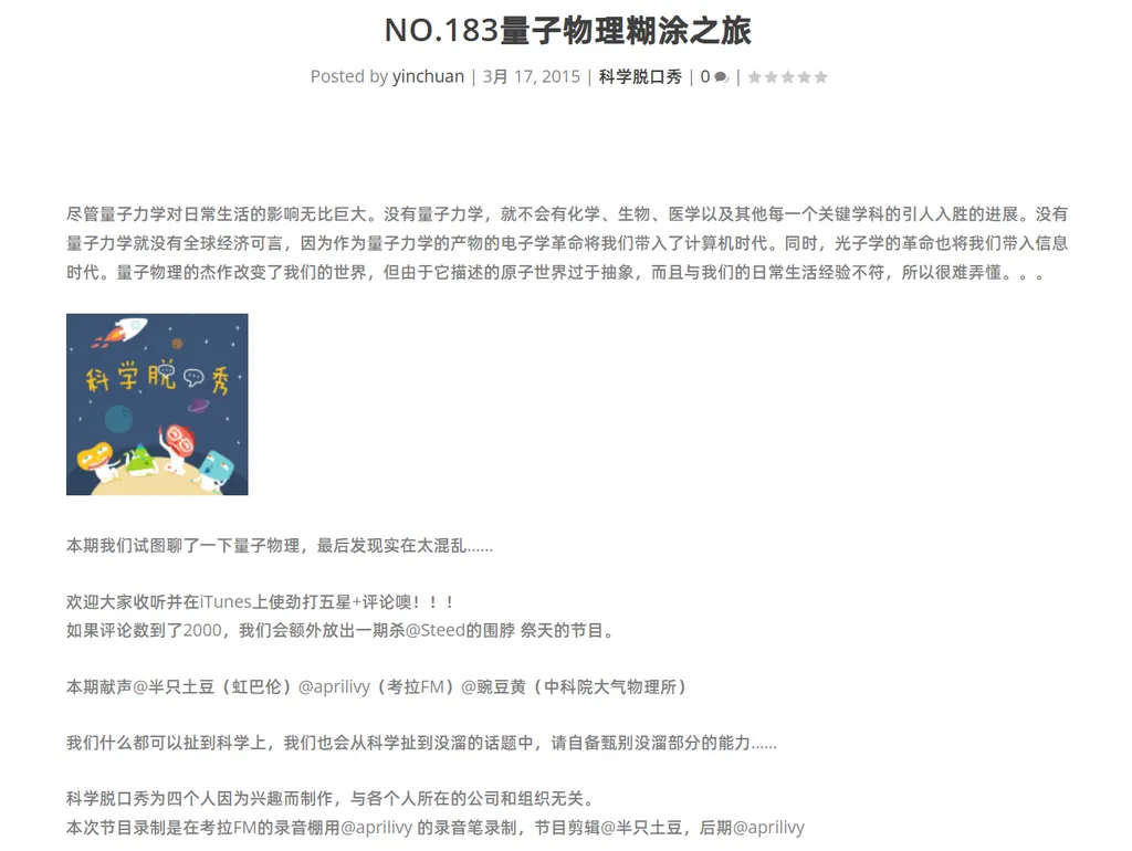 “播客”是ios的原生app,它类似于喜马拉雅,但app内部没有那么多“狗皮膏药”。那个时候“知识付费”的概念还未兴起,音频类节目也同样寥寥无几,与现在相比,当时排行榜的前几名完全称不上“正经播客”:《锵锵三人行》和《郭德纲相声合集》都是视频转音频,只有《科学脱口秀》《糖蒜广播》算是正儿八经的“Podcast”。我随便点开了一集《量子物理糊涂之旅》,好像又偶遇了“果壳”的那些人,听“半只土豆”“植物人史军”谈天说地,便被这种“新”的内容形式迷住了,原来可以不只看公众号,知识也可以如此轻松地送入自己脑中。