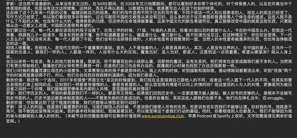 2019年,界面新闻的张之琪和傅适野、黄月共同开创了一档新节目《剩余价值》,不到一年就被Apple Podcast选为年度最佳播客、最受欢迎新播客。在疫情期间,这档播客也成为了我反复收听的对象。Vol.51让我印象最深——《瘟疫、语言和具体的人:与历史学家罗新的聊天》。这集持续一个半小时,从疫情封城的状态出发,又回到什么是人的根本问题——作为在极端现实中保持理性和共情的“具体人”,那让我天真地以为,只要戴上耳机,就能在这场混乱之外保留一块精神飞地。
