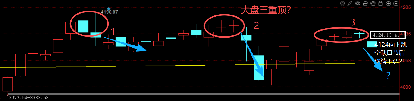 但今天大盘一度跌破4100点,一直在这个关键临界点上震荡,所以就给节后增加了很大的不确定性。如果节后继续回落,有可能前天反弹4142高点和之前的4190,4170形成三个高点逐步回落的态势。如图: