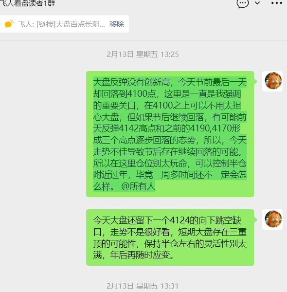 而且今天大盘还留下一个4124的向下跳空缺口,走势不是很好看,短期大盘存在三重顶的可能性,保持半仓左右的灵活性别太满,如果仓位过高且持仓个股走势一般,应减仓到半仓附近,年后再随时应变。 即便春节后大盘企稳,只要大盘稳定,啥时候加仓都有机会