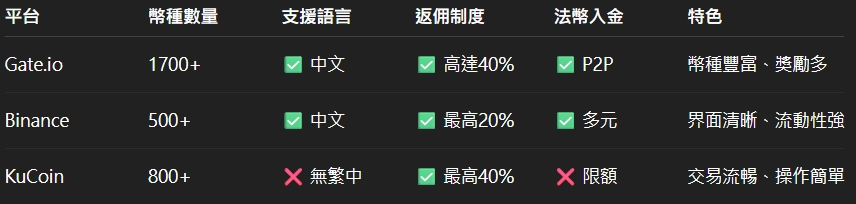 Gate.io 與其他交易所比較(Binance、KuCoin)
