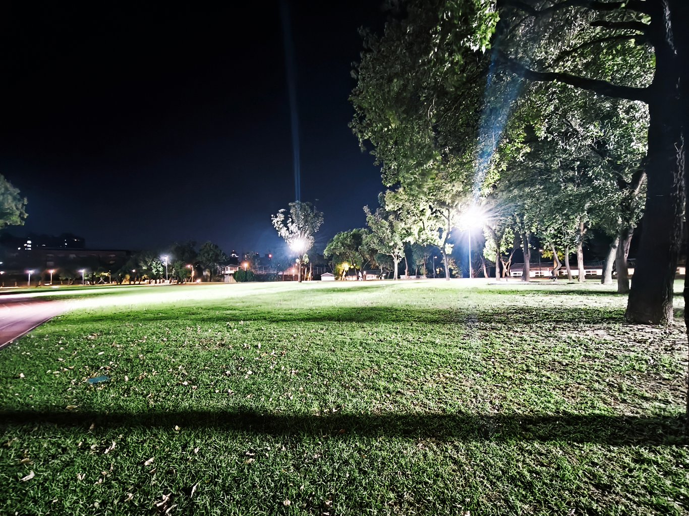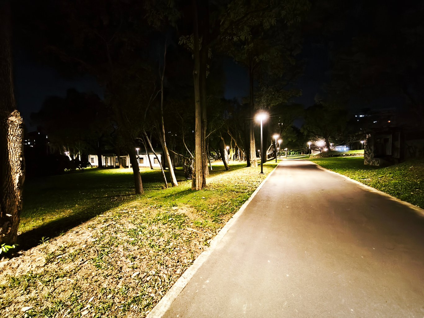 夜晚的步道,靜靜延伸,路燈在黑暗中點亮一條溫柔的線,光影交錯,讓孤獨有了形狀;彩色的夜,卻在微暖的燈光裡,藏著生活的氣息,草地的綠、樹影的深,提醒著生命仍在流動。同一條路,兩種語言,一種是沉默,一種是溫柔。