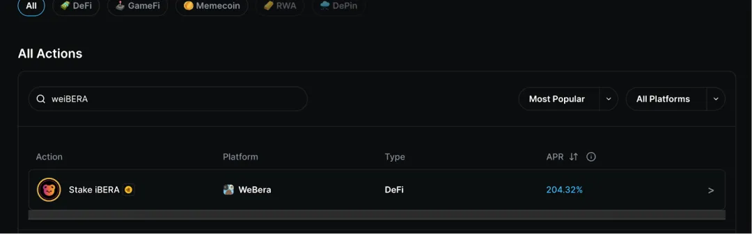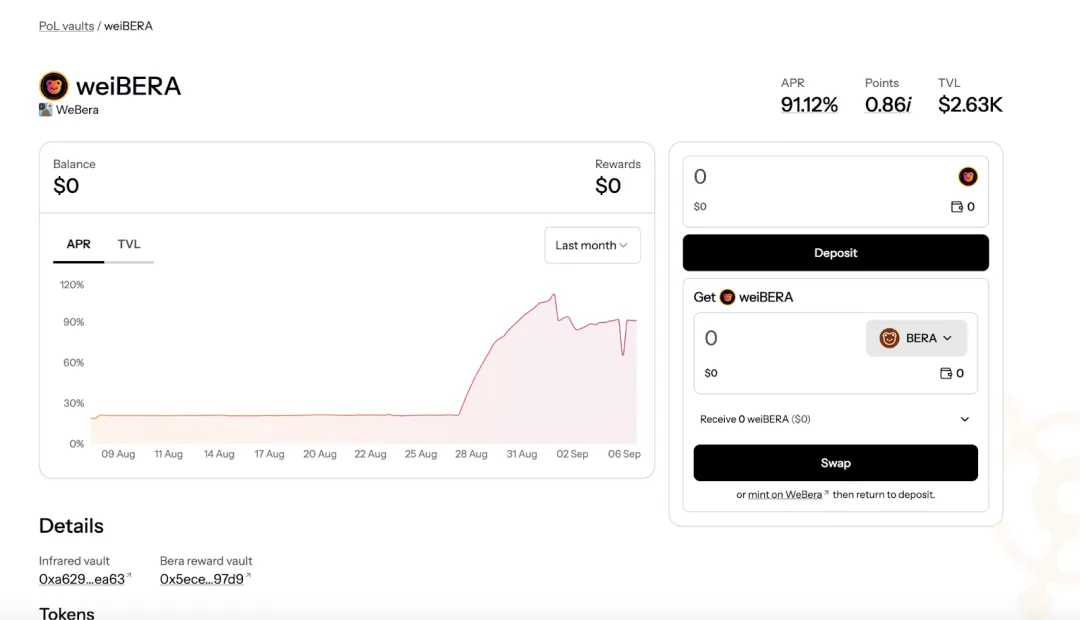 当然,我们同样可以将 iBERA 兑换为 weiBERA,并且将 weiBERA 在该页面进一步质押获得 90%+的 APR,并获得 Infared 积分(目前看其积分权重不高仅为 0.86),该方式目前看没有 iBERA/mBGT的方案划算。