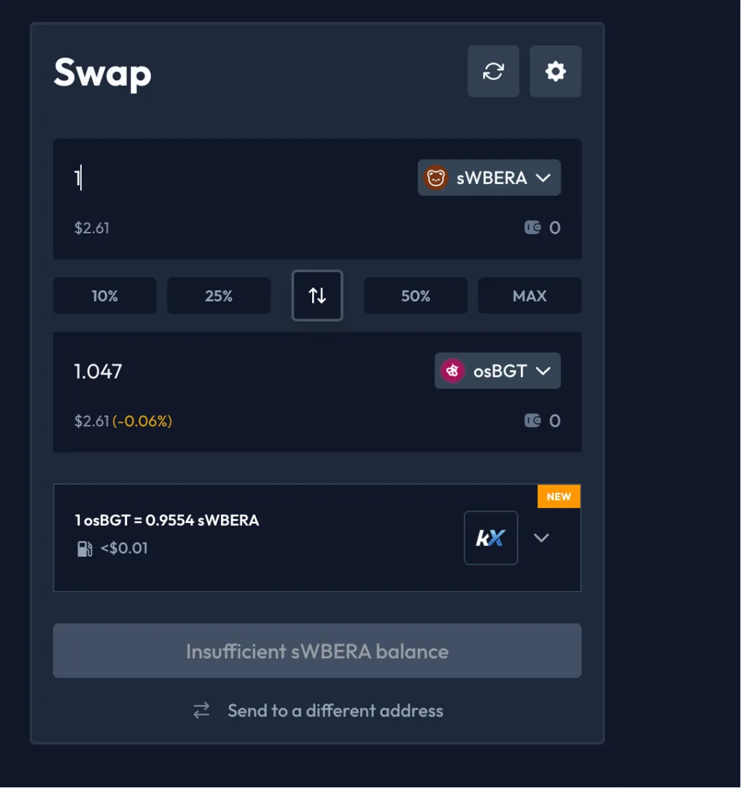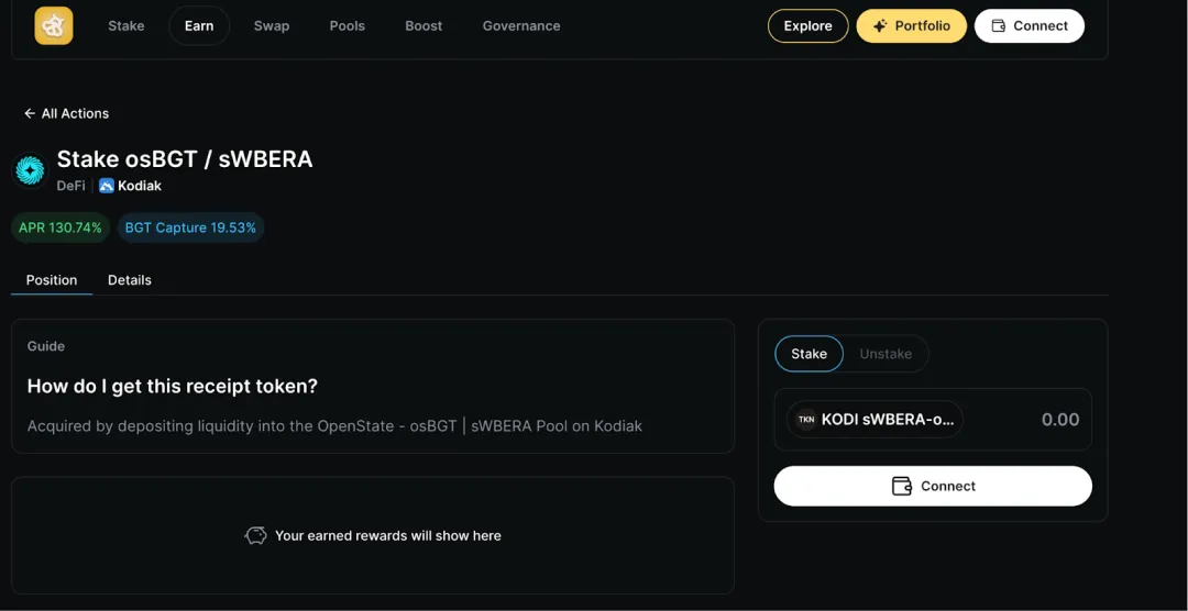 我们可以在 kodiak 上,通过 Swap 上将一部分 sWBERA Swap 为 osBGT。