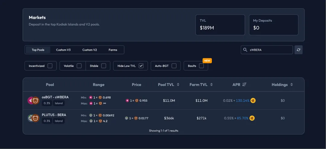 比如在 kodiak 上有 osBGT/sWBERA LP 池,并且整体的 APR 在 129%(这其中包括了交易手续费分配、Farming 以及治理代币 BGT 的综合激励)。