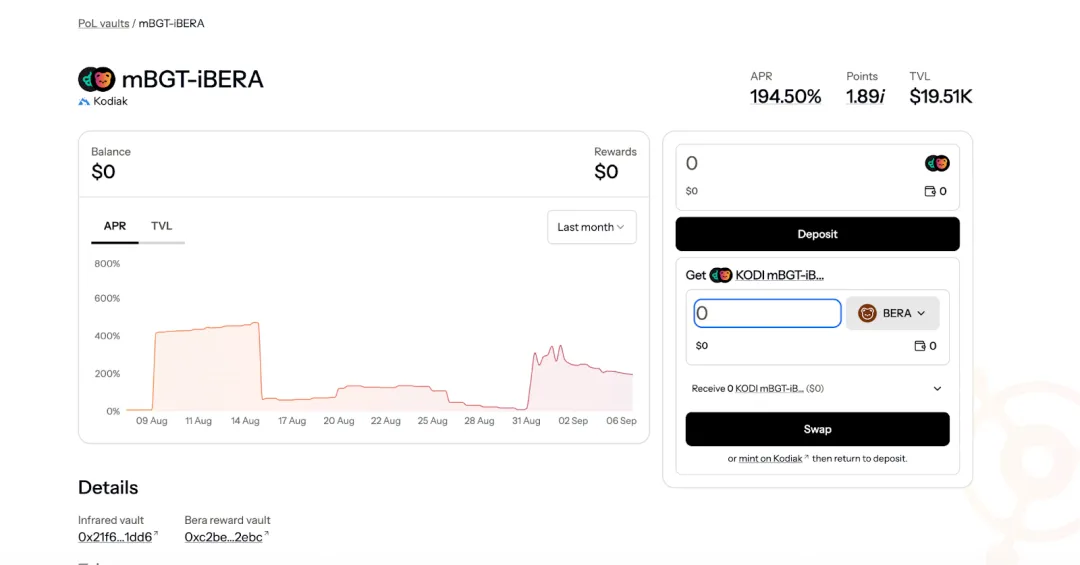 在获得 iBERA 后,我们可以将 iBERA 与其他资产进一步组成 LP,Infrared 的 PoL Vaults 板块展示了目前一些支持 IBERA 的 PoL 池, 我们可以选择一个收益率比较高的,比如 mBGT-iBERA 池子的 APR 整体不错,大约为 194%。