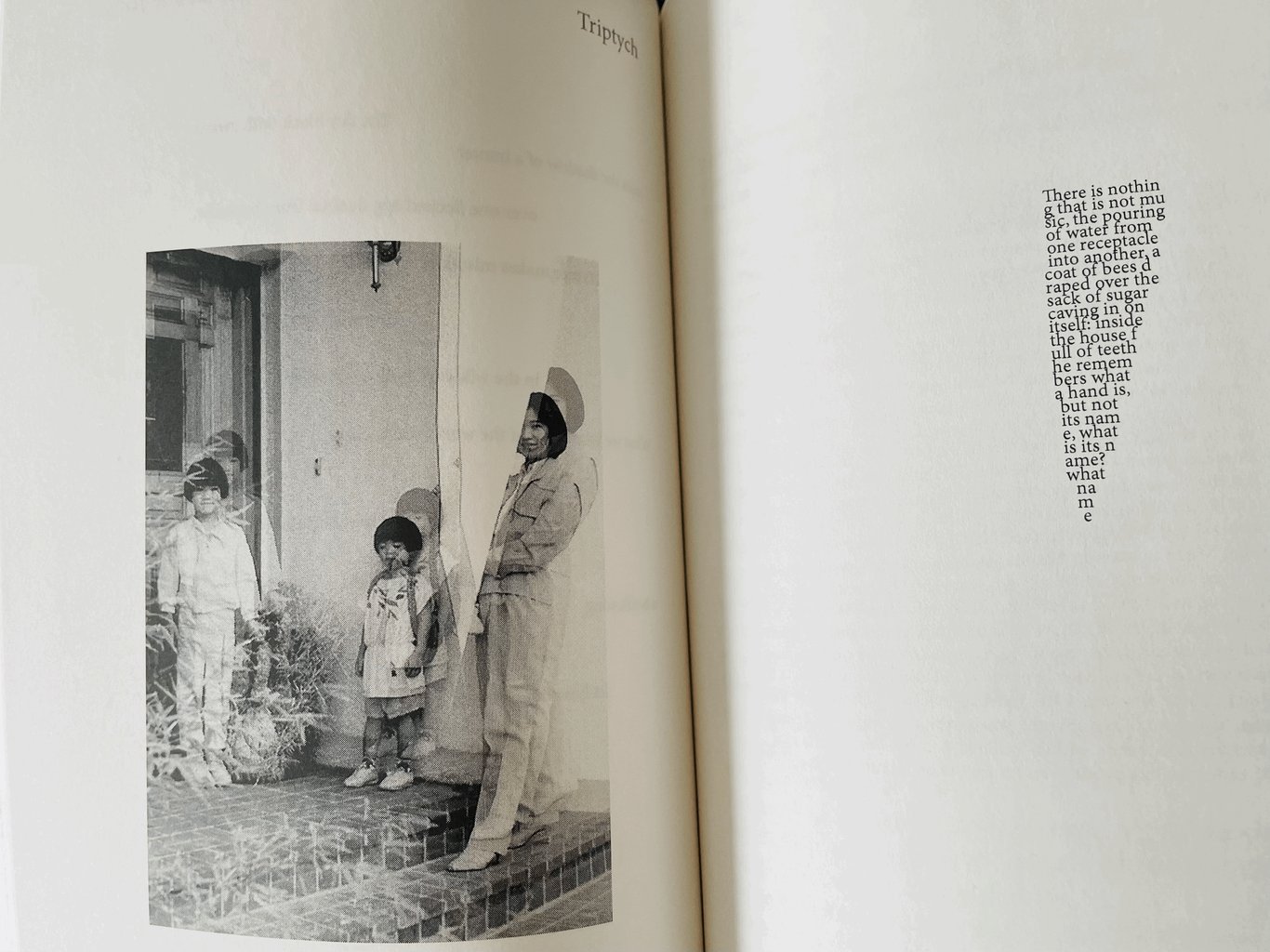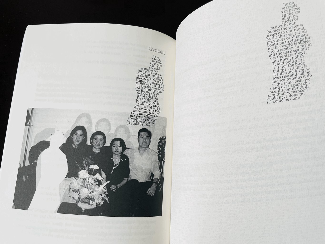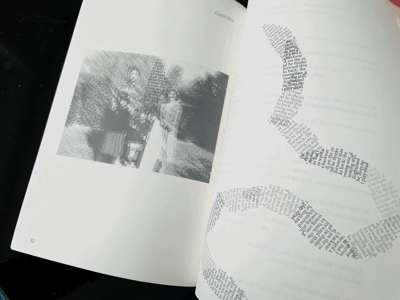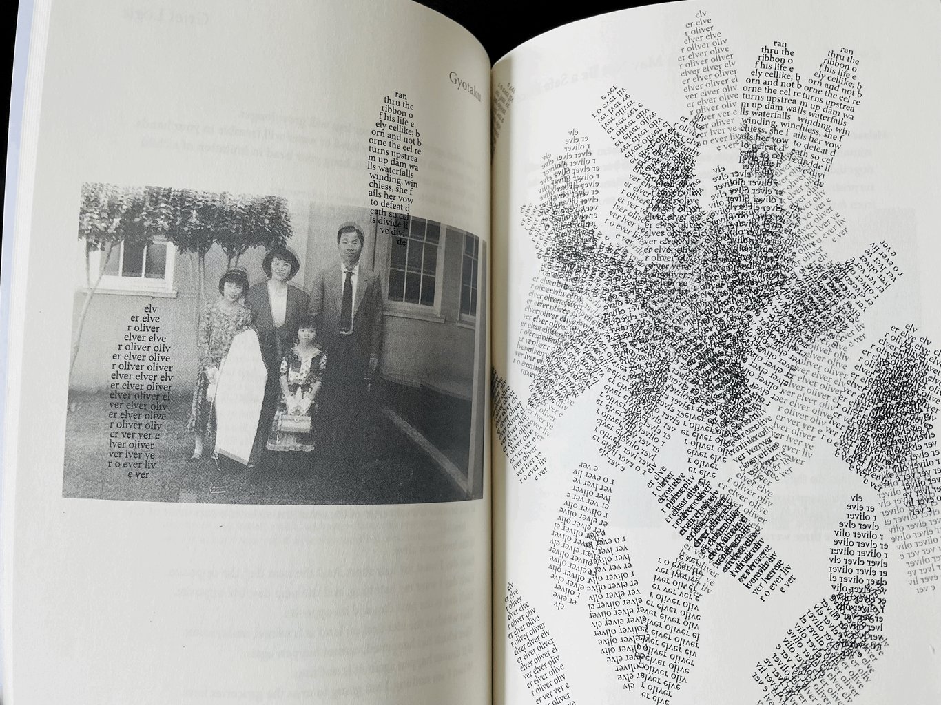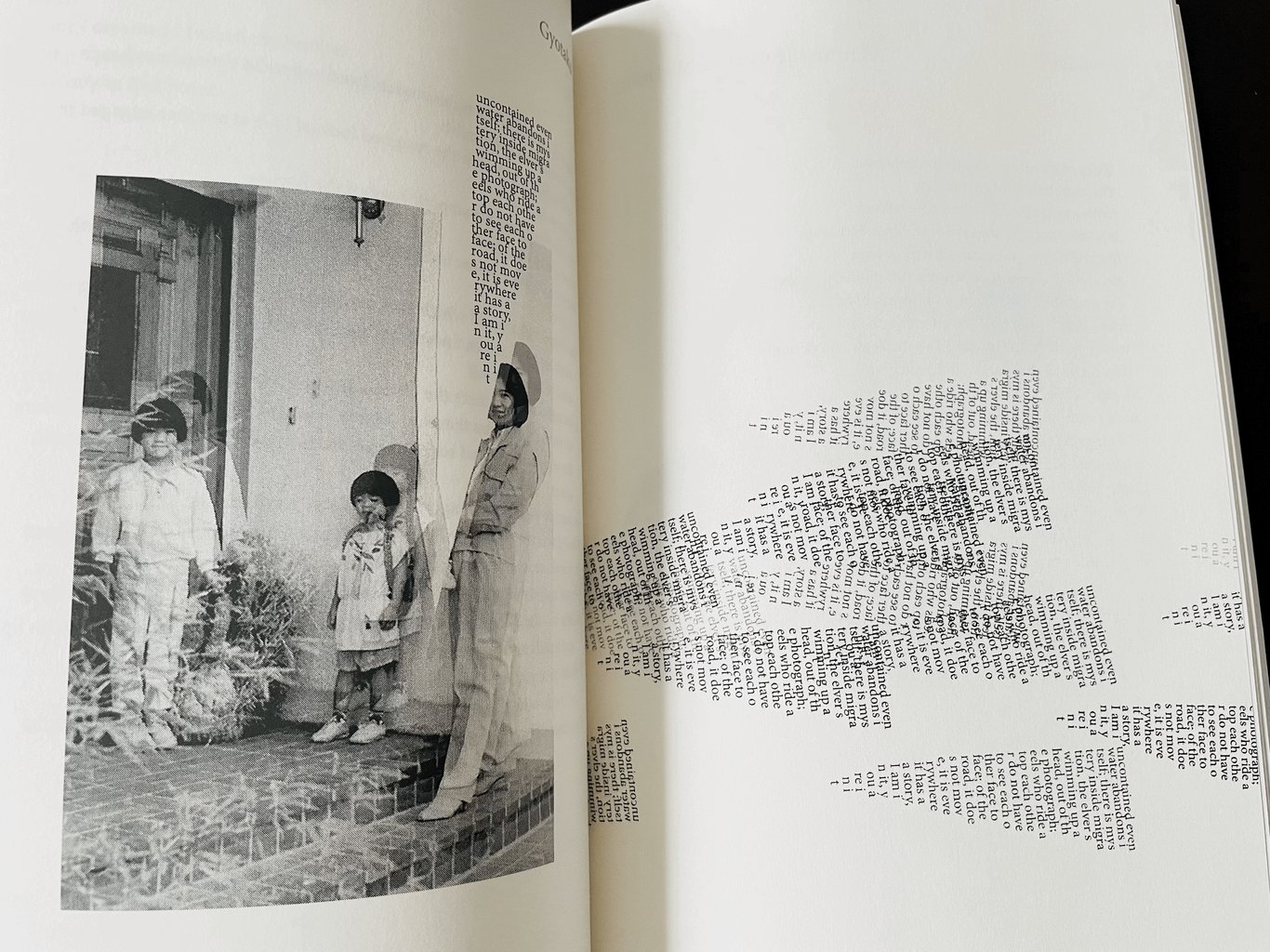 家人的照片和文字/家人的照片和文字⋯⋯這是Diana詩集的形式,照片中的弟弟被挖掉,展示模糊剩下的家庭成員,他為什麼不能出現在照片上?而是成了不斷重複的幾乎無法閱讀的文字?